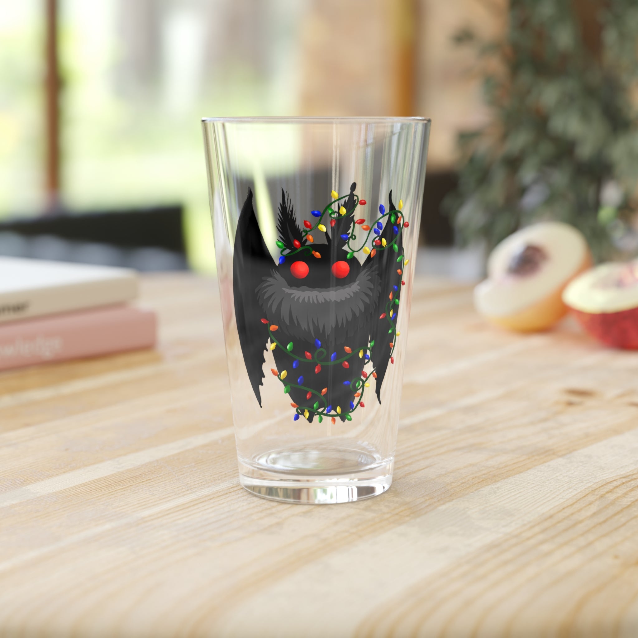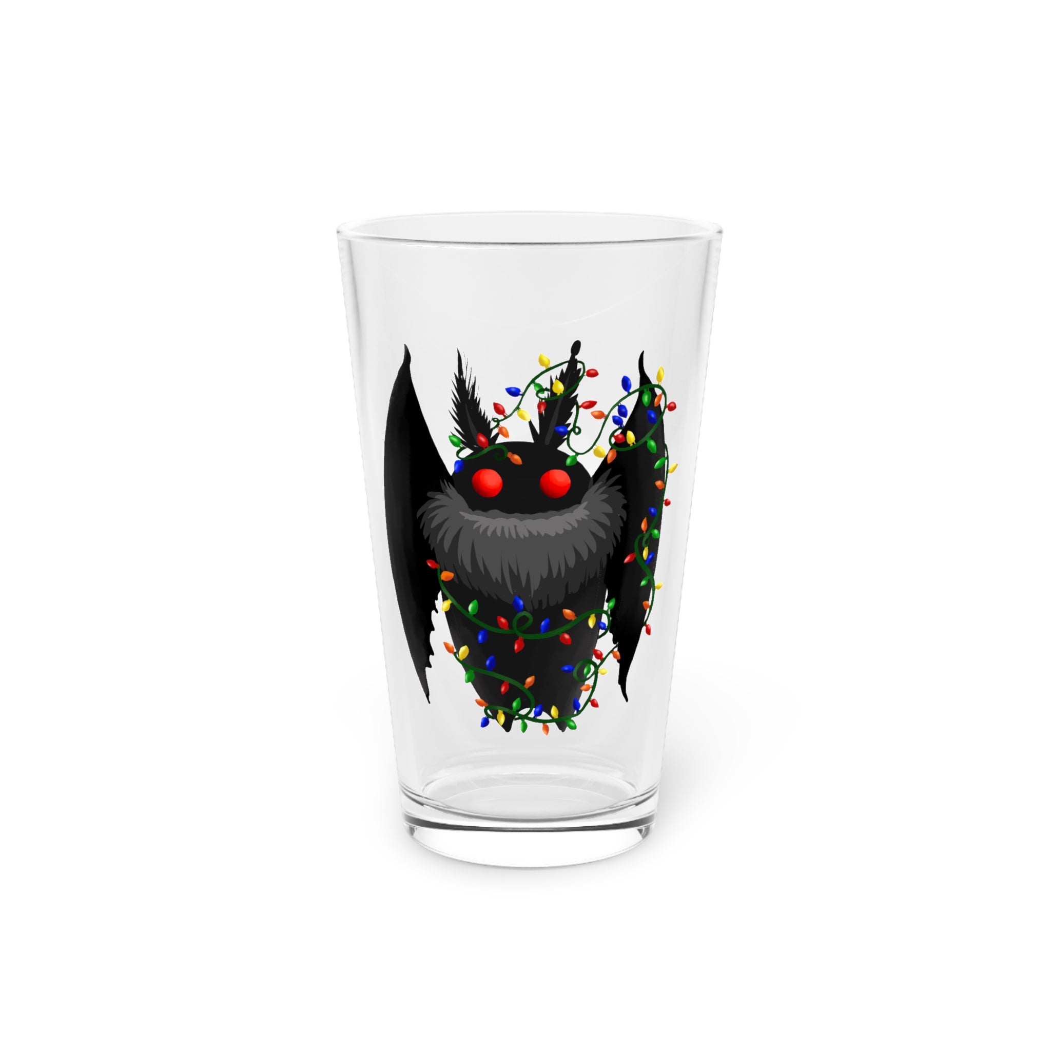 A playful, slightly spooky pint glass that brings a wink of holiday mischief to your table. A fuzzy little bat — eyes glowing red and tangled in colorful string lights — perches on clear glass, ready to hold a cold beer, cider, or whatever you reach for after a long day. It fits into cozy movie nights, haunted-house decorating sessions, or a low-key holiday party where people appreciate dark-humor charm. The image sits cleanly on transparent glass so the design seems to float with your drink, adding personality without shouting.