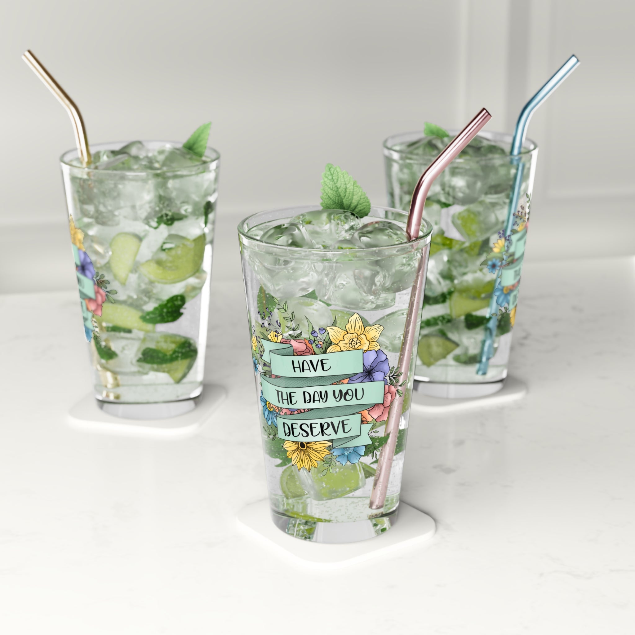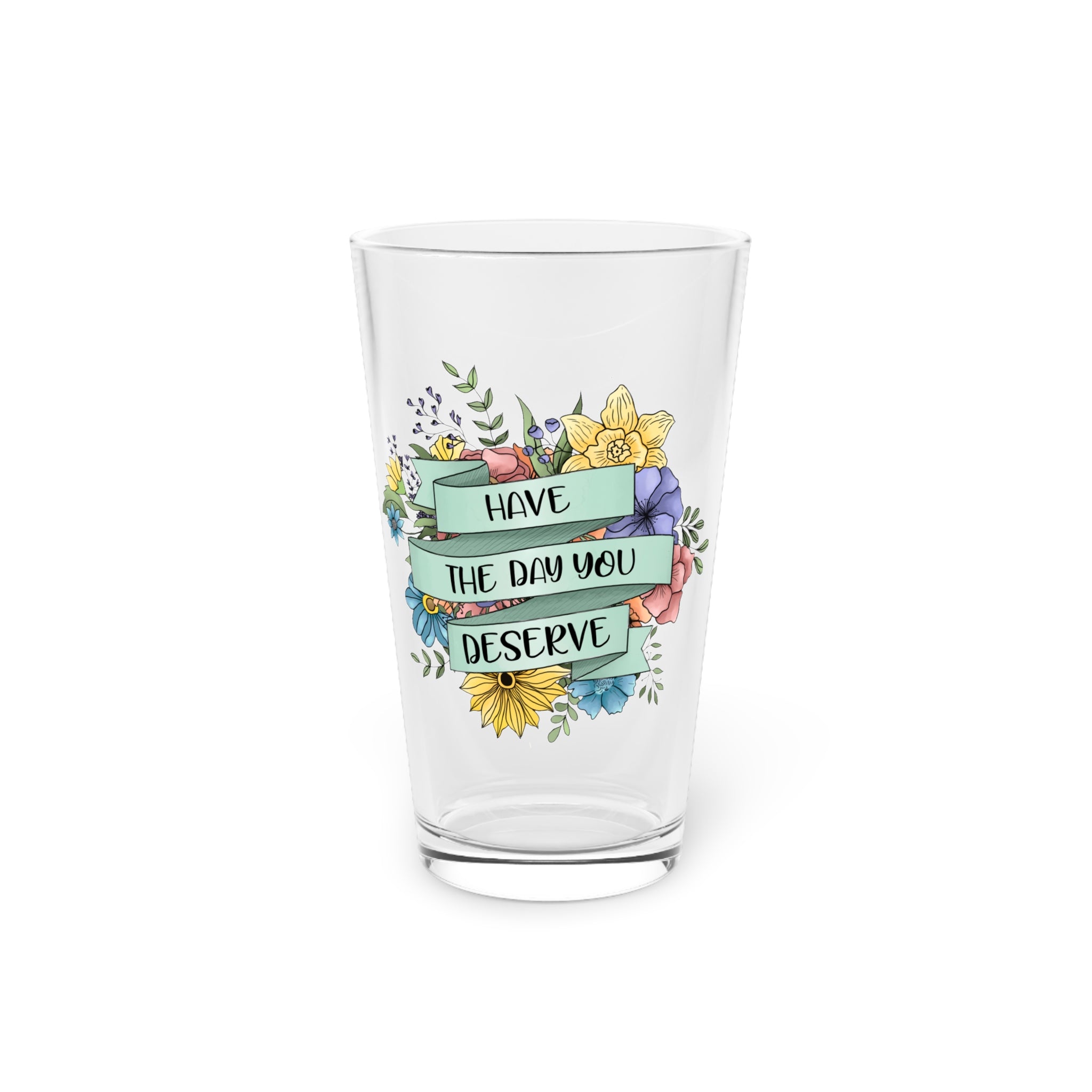 This 16 oz pint glass brings a little encouragement to everyday moments. A soft ribbon wraps around a bright bouquet of florals with the hand-lettered message “Have the day you deserve,” so each sip feels like a gentle nudge toward calm and self-kindness. The clear glass keeps the artwork visible from multiple angles while letting your favorite beer, juice, or iced tea show through. Sturdy yet elegant, it sits comfortably in hand and looks right at home on a kitchen counter, picnic blanket, or bedside tray when you need a small, personal lift.