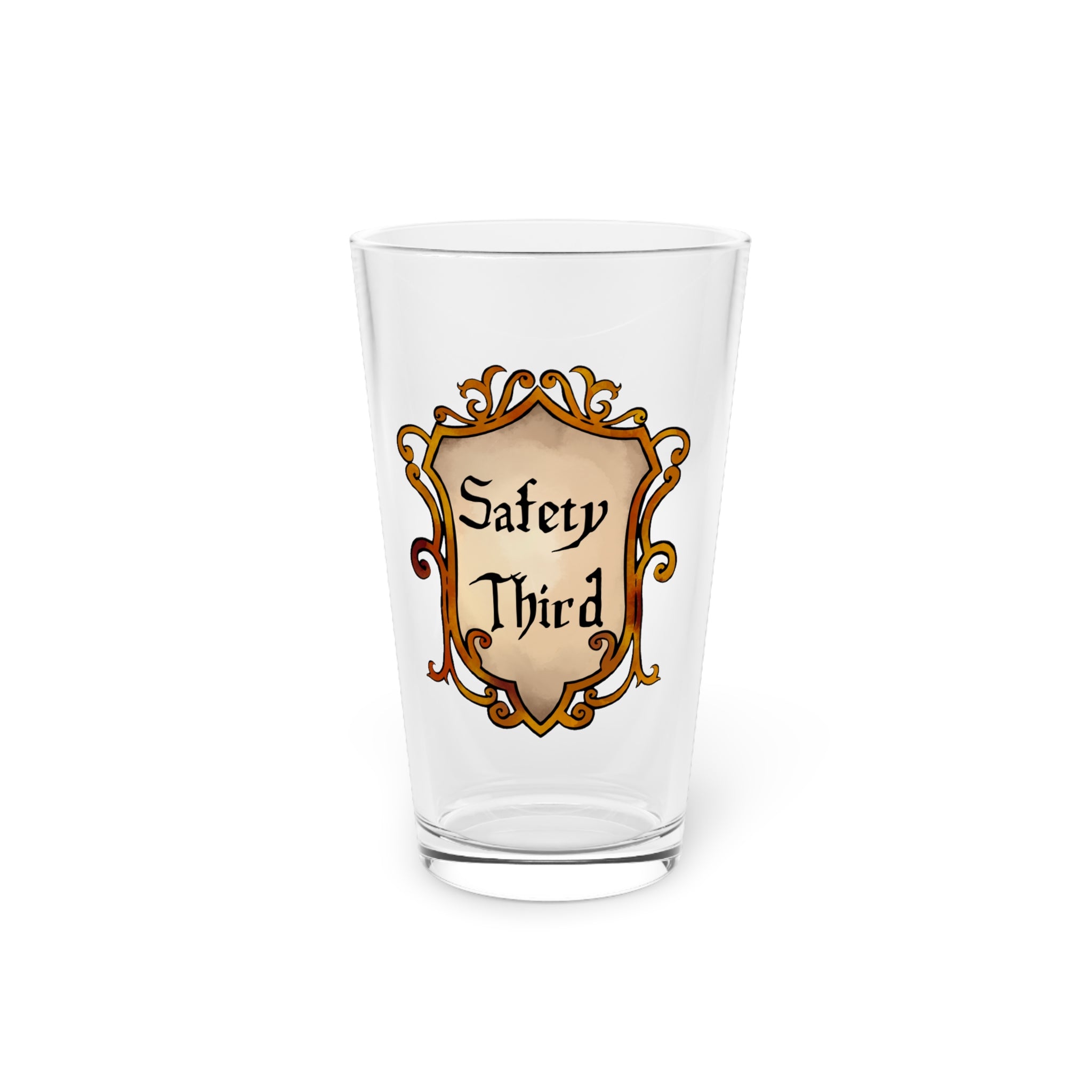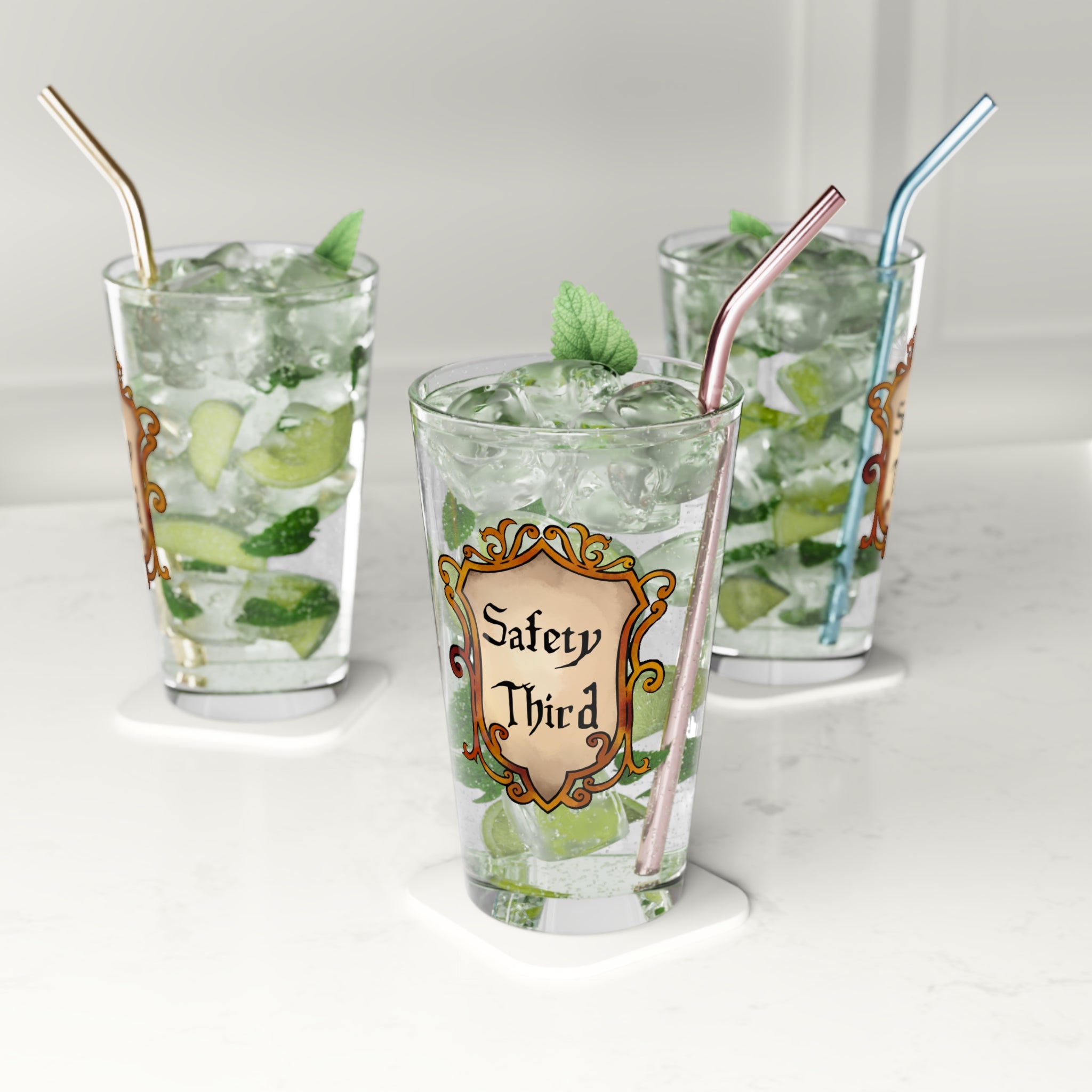Raise a glass to story-rich gatherings with this 16 oz pint glass, stamped with an antique-style shield that reads “Safety Third.” The ornate crest adds a touch of tongue-in-cheek whimsy—equal parts pub sign and heirloom curiosity—so every sip feels like a shared wink around the table. The clear glass lets your drink show through, while the warm, vintage palette of the design brings a cozy, lived-in vibe to casual nights, backyard barbecues, and low-key get-togethers. Durable enough for frequent use and lighthearted in spirit, it fits seamlessly into a kitchen shelf full of character or a home bar built for good stories and better company.