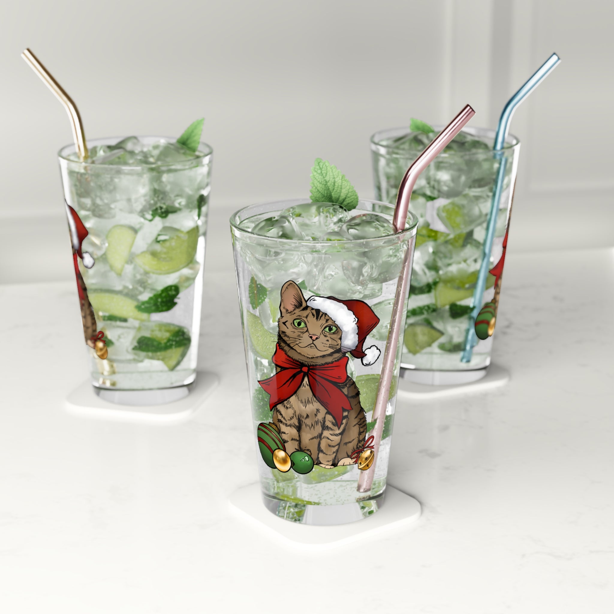 Bring a little holiday mischief to your table with this 16 oz pint glass featuring a charming tabby cat in a Santa hat and festive bow. The illustration—bright, detailed, and full of personality—feels like a soft nudge from a friend who loves cozy nights, mulled cider, and quiet moments by the tree. Lightweight and clear, the glass shows off your drink while the playful design adds warmth to everyday routines and seasonal gatherings. Use it for cold beer, sparkling cider, juice, or water; it sits comfortably in hand and brightens any shelf or drink cart. The design is subtle enough to blend into everyday use yet special enough to bring a smile during holiday dinners, cookie exchanges, or relaxed evenings on the couch.