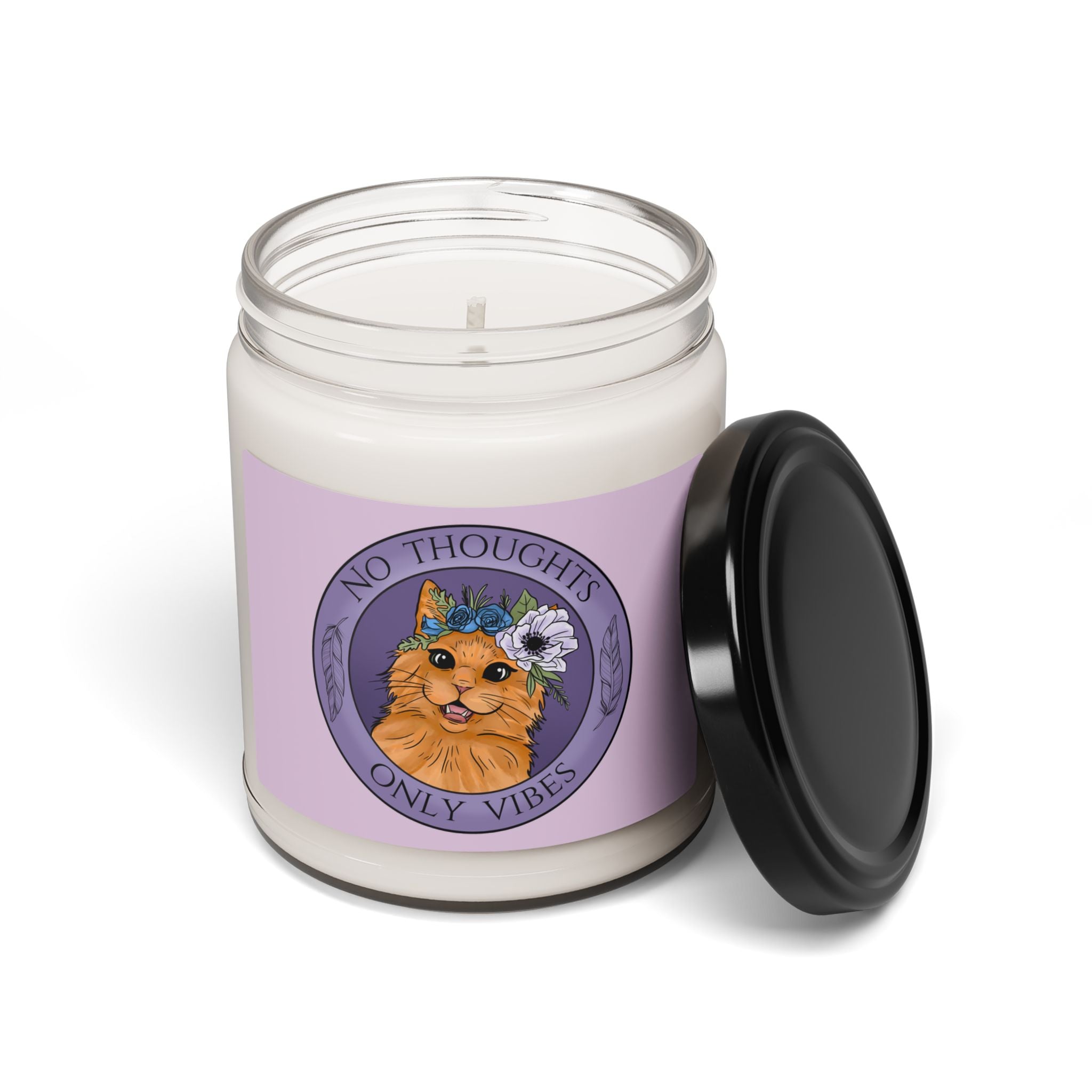 A hand-poured soy candle poured into a reusable glass jar that brings calm, warmth, and personality to small moments. The label features a whimsical orange cat crowned with flowers and the motto “No Thoughts — Only Vibes,” setting a playful, meditative tone for your space. Choose from twelve curated scents — from Cinnamon Vanilla and Christmas Warmth to Sea Salt + Orchid or Unscented — all made with a 100% natural soy wax blend, cotton wick, and infused with natural essential oils where noted. Burns cleanly for 50–60 hours and arrives in a glossy, permanent-label jar that’s easy to clean and repurpose as decor once the wax is gone. Assembled in the USA to ASTM safety standards, this candle is vegan, non-toxic, and free of parabens, phthalates, synthetic dyes, and plastics.