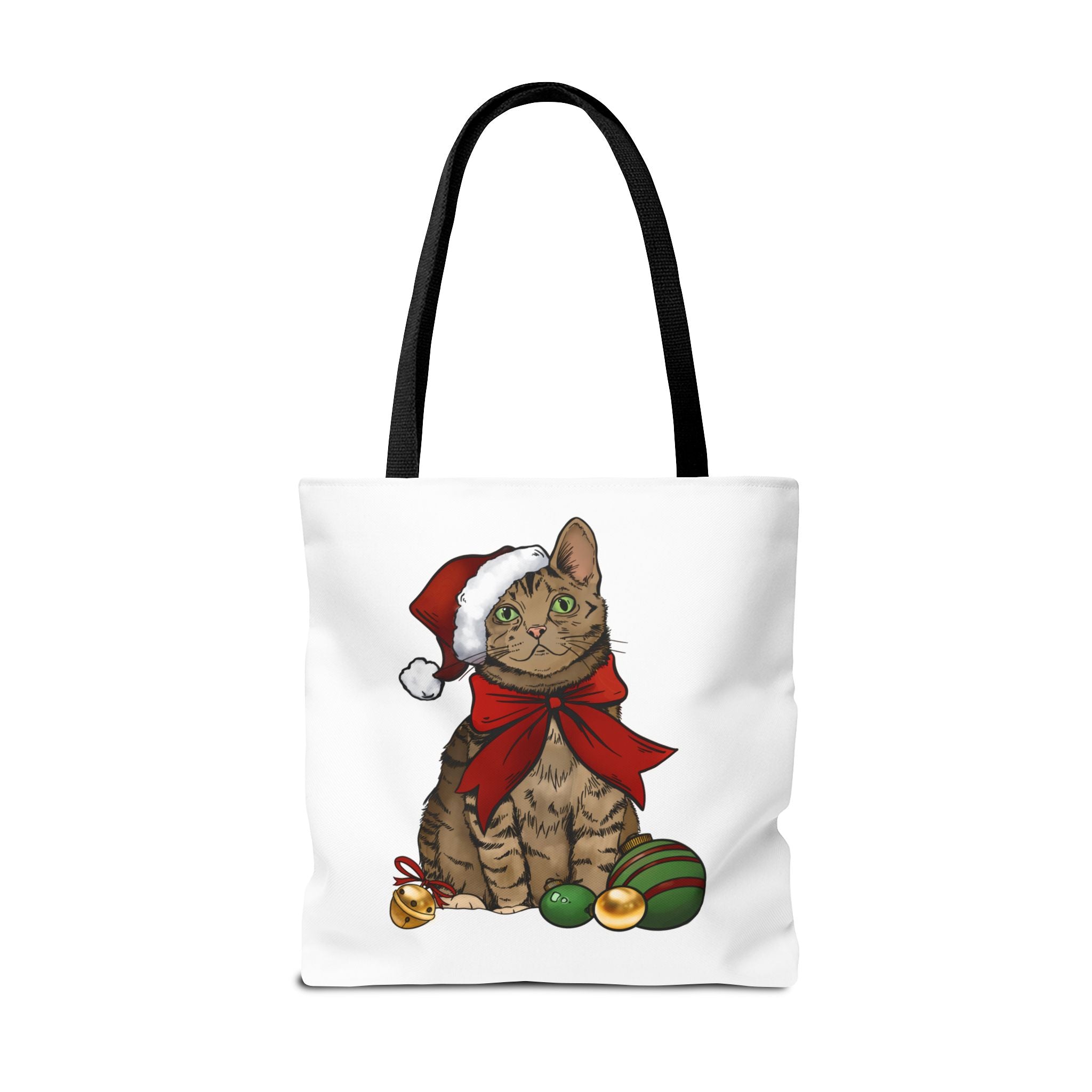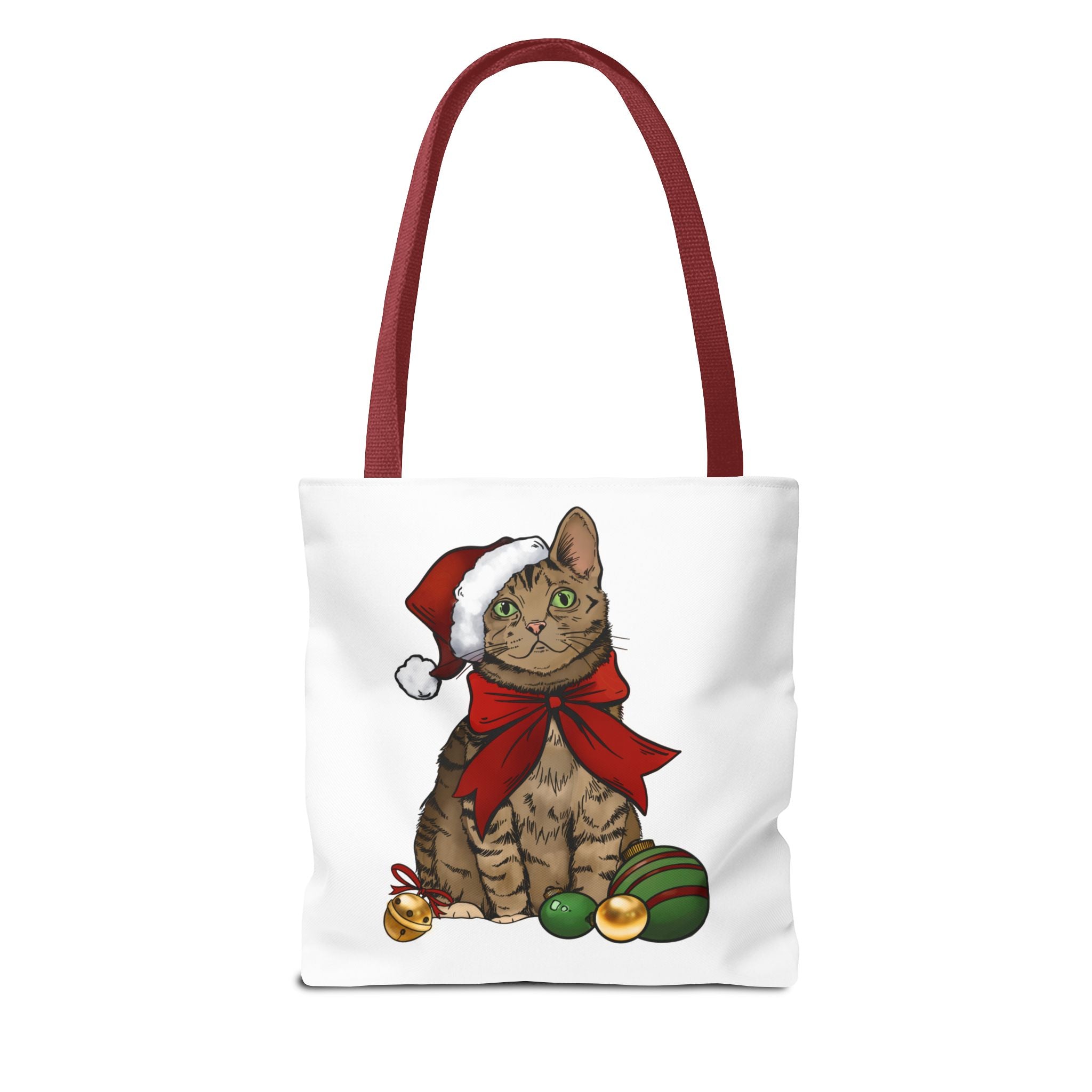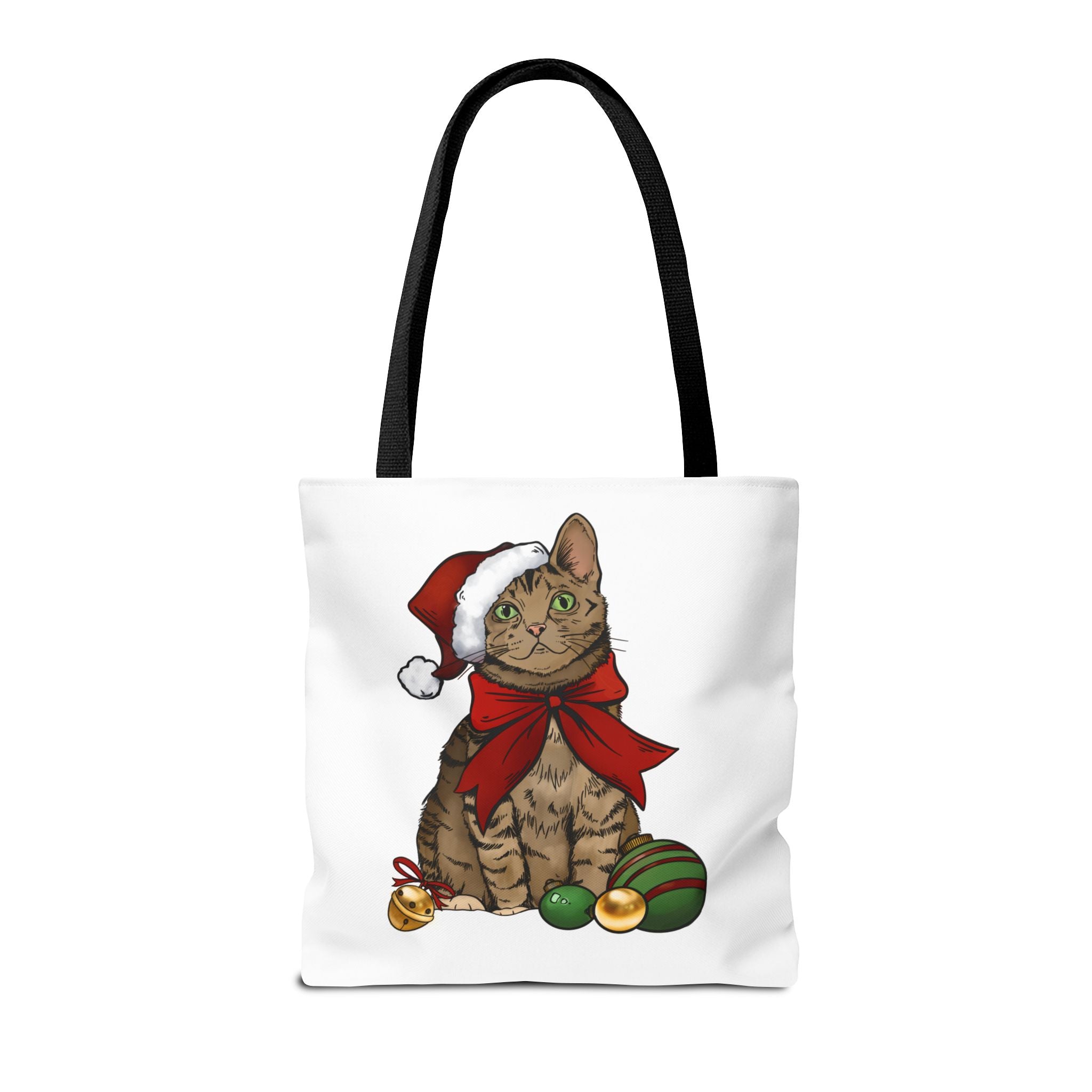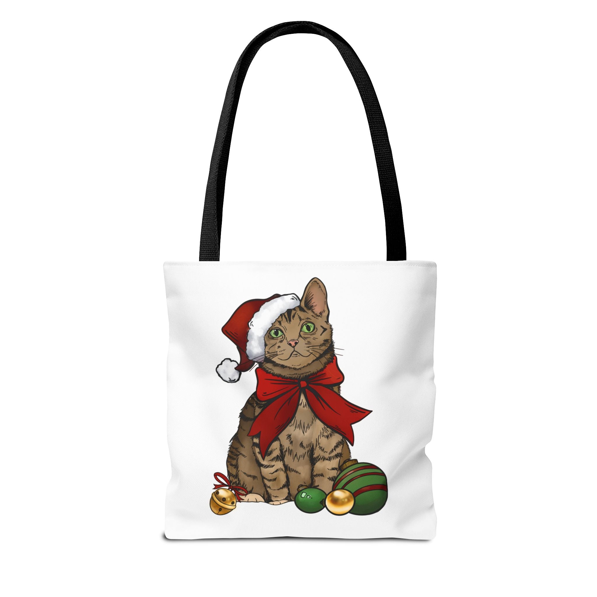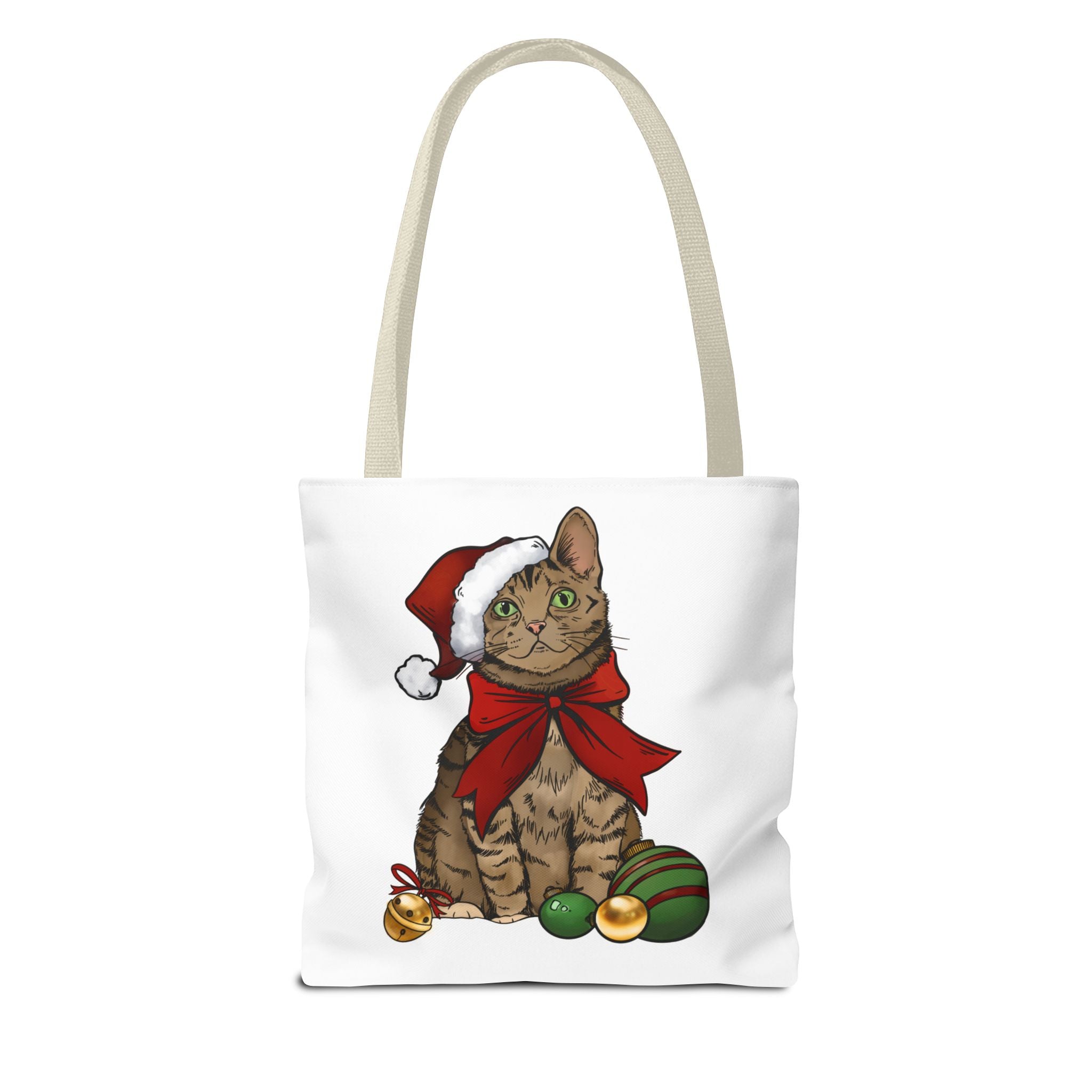 A festive, illustrated tote that brings gentle holiday cheer wherever you go. The white, durable polyester surface showcases a warm tabby cat wearing a Santa hat and oversized red bow, surrounded by green and gold ornaments. The image has a hand-drawn, cozy feel — like a favorite holiday card turned into a carry-all. Lightweight yet sturdy, the tote slips over your shoulder with colored handles and boxed corners that give extra room for groceries, books, or market finds. It’s the kind of everyday accessory that adds a little seasonal smile to errands, tree-lighting nights, or casual winter gatherings.