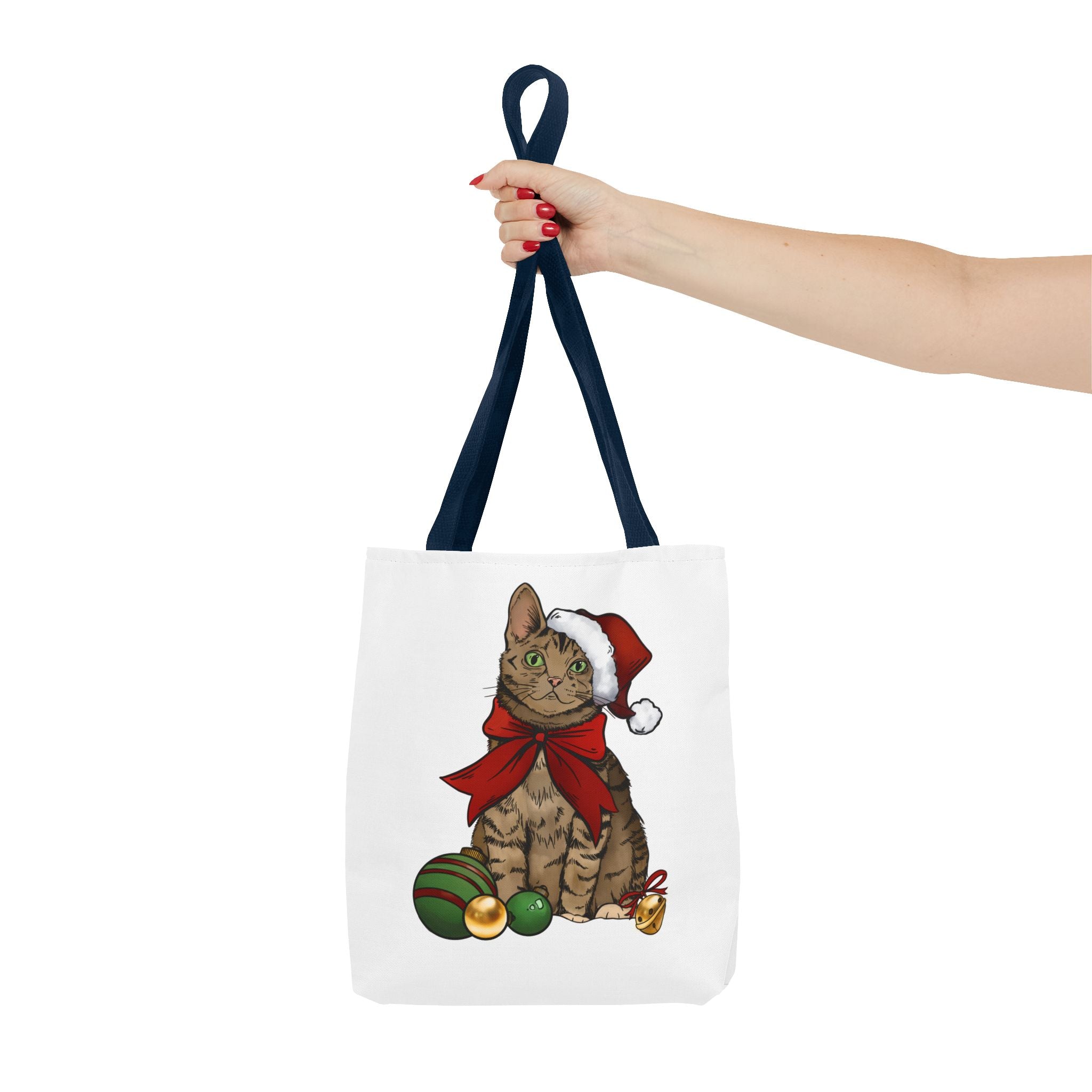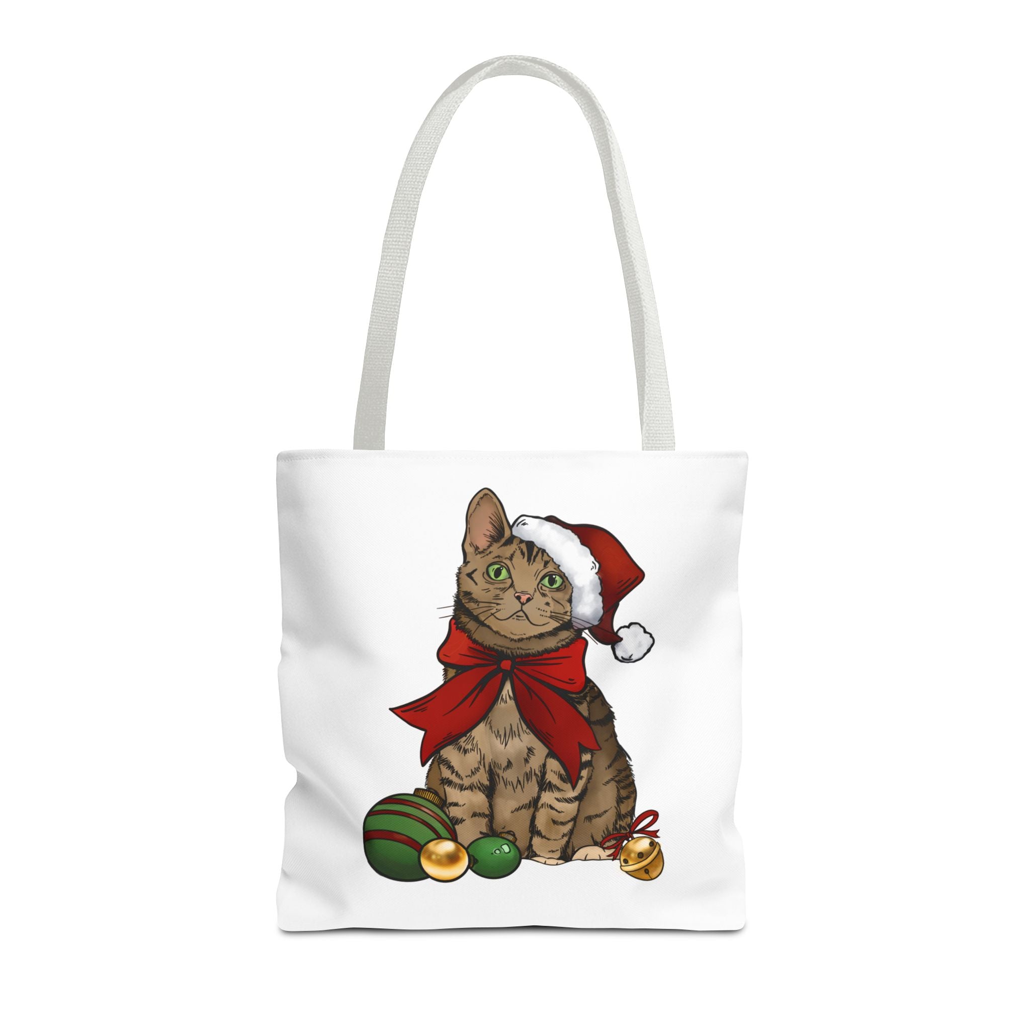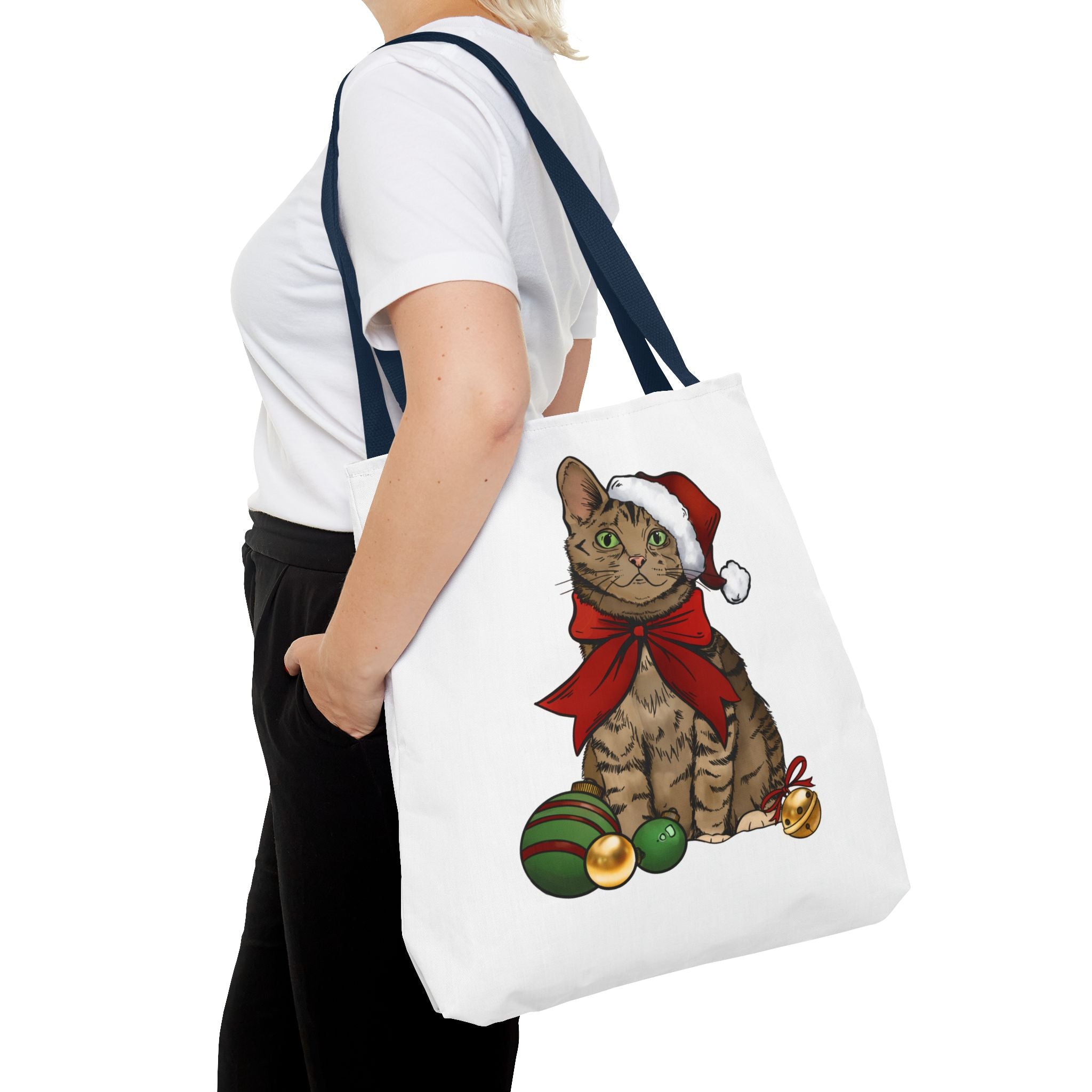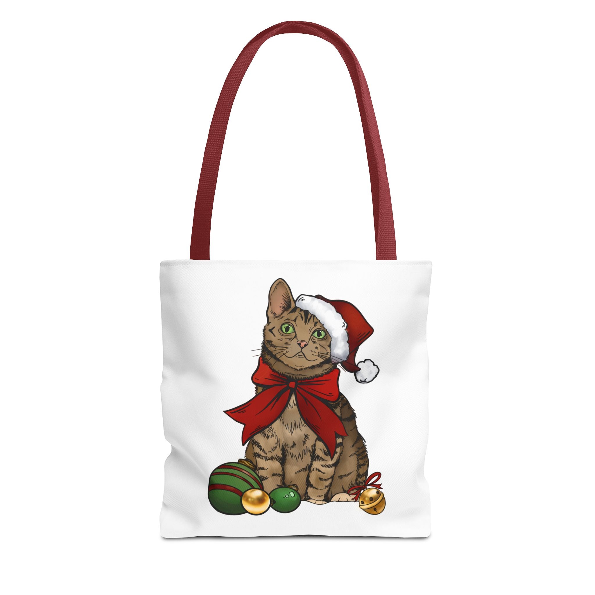 A festive, illustrated tote that brings gentle holiday cheer wherever you go. The white, durable polyester surface showcases a warm tabby cat wearing a Santa hat and oversized red bow, surrounded by green and gold ornaments. The image has a hand-drawn, cozy feel — like a favorite holiday card turned into a carry-all. Lightweight yet sturdy, the tote slips over your shoulder with colored handles and boxed corners that give extra room for groceries, books, or market finds. It’s the kind of everyday accessory that adds a little seasonal smile to errands, tree-lighting nights, or casual winter gatherings.