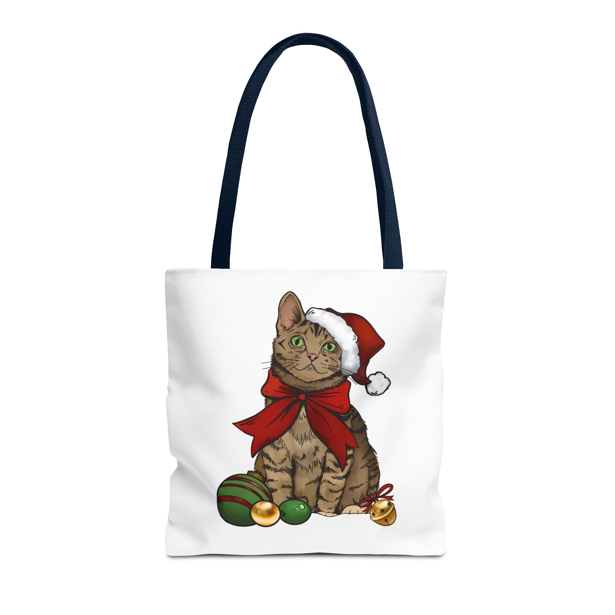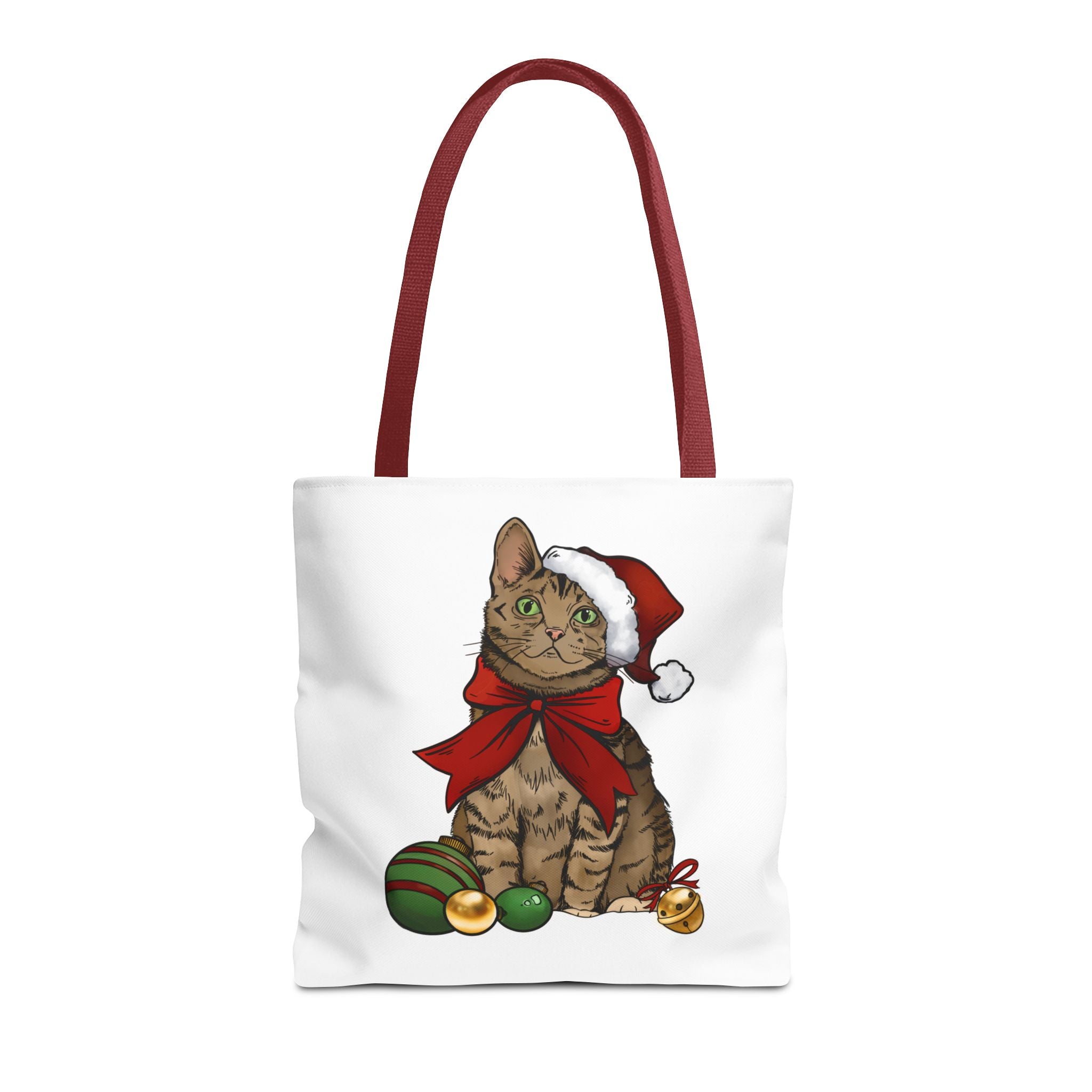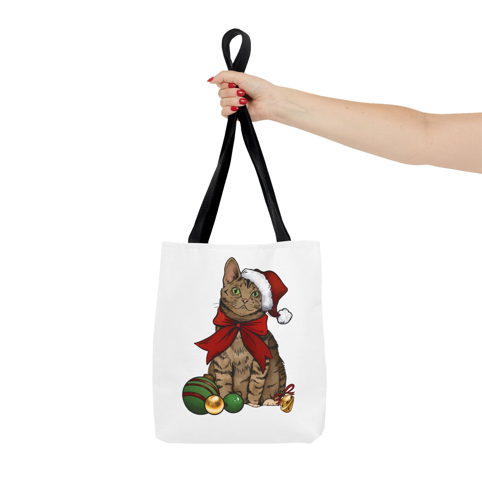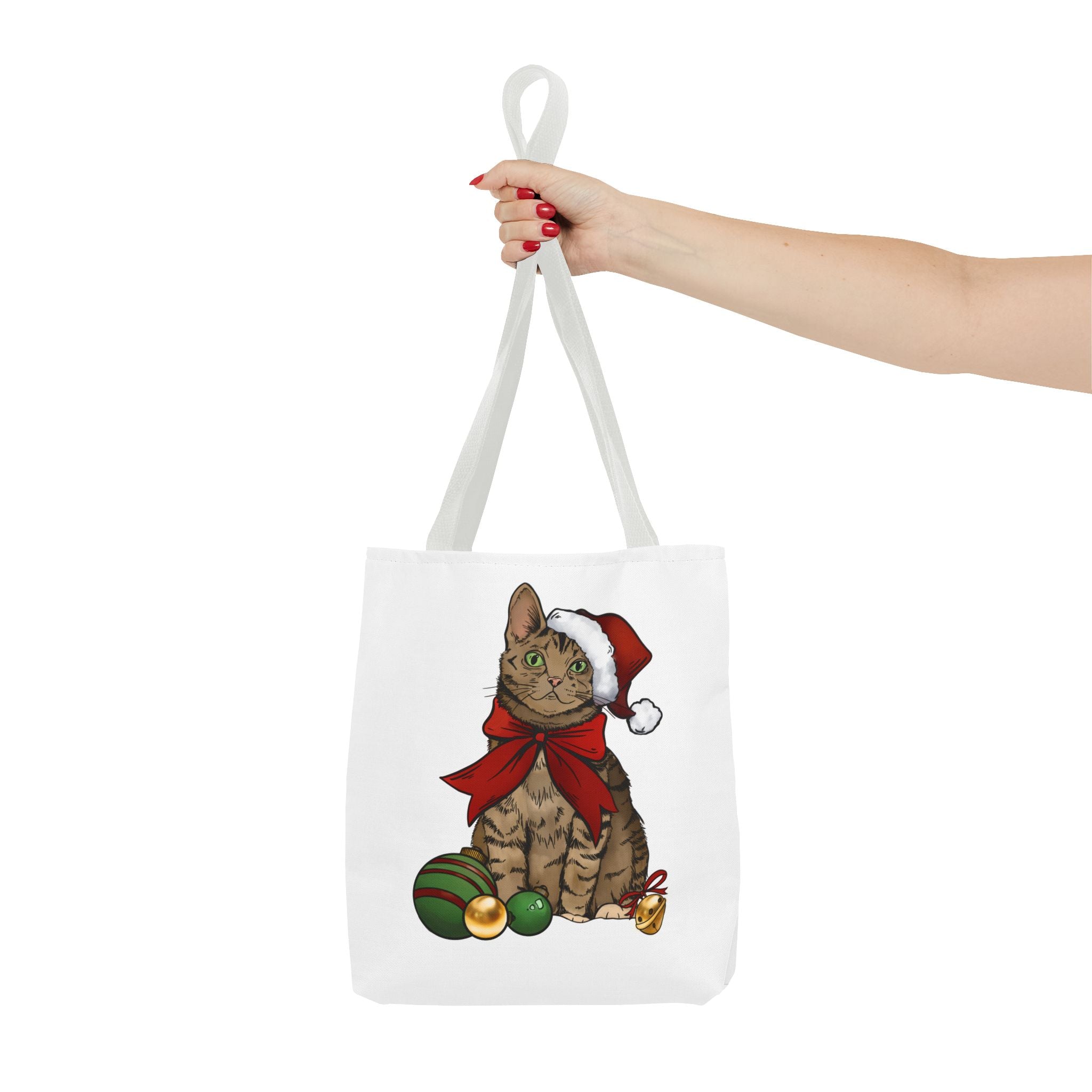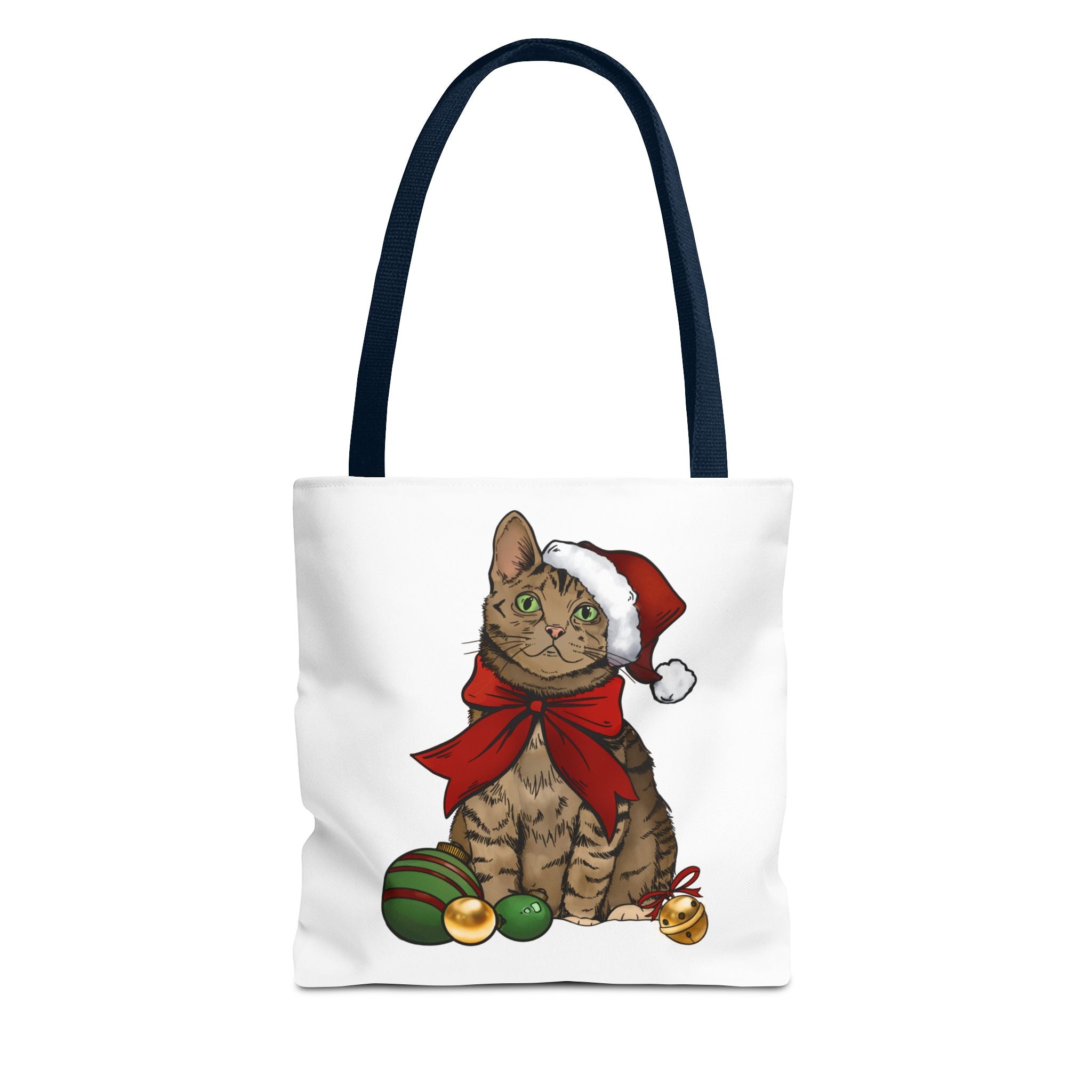 A festive, illustrated tote that brings gentle holiday cheer wherever you go. The white, durable polyester surface showcases a warm tabby cat wearing a Santa hat and oversized red bow, surrounded by green and gold ornaments. The image has a hand-drawn, cozy feel — like a favorite holiday card turned into a carry-all. Lightweight yet sturdy, the tote slips over your shoulder with colored handles and boxed corners that give extra room for groceries, books, or market finds. It’s the kind of everyday accessory that adds a little seasonal smile to errands, tree-lighting nights, or casual winter gatherings.