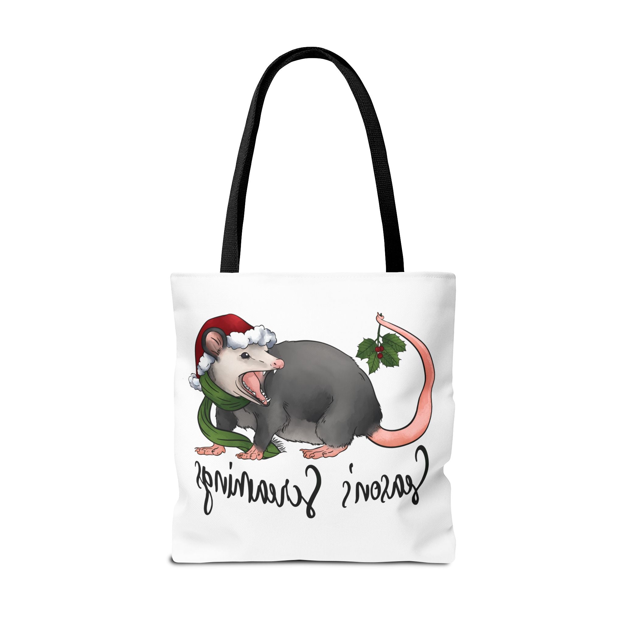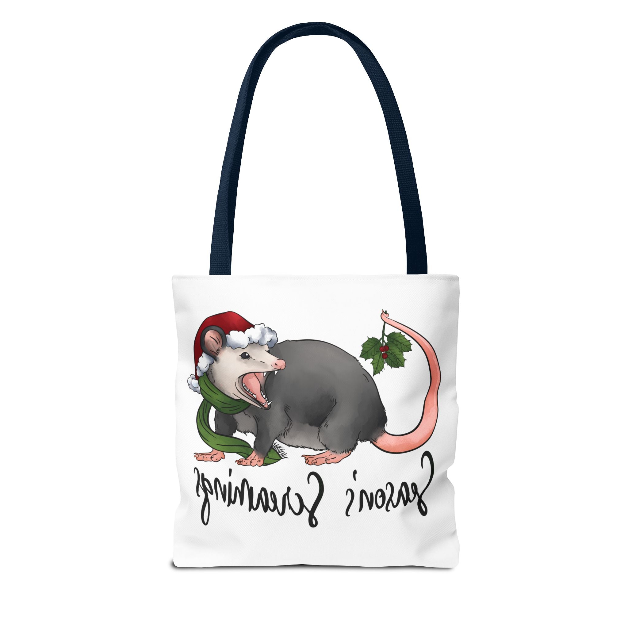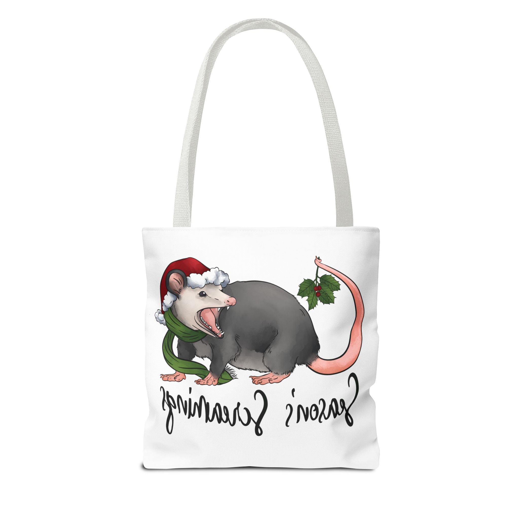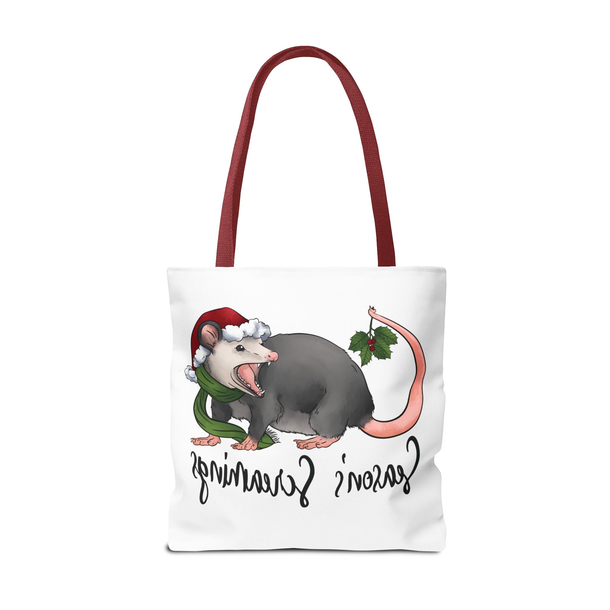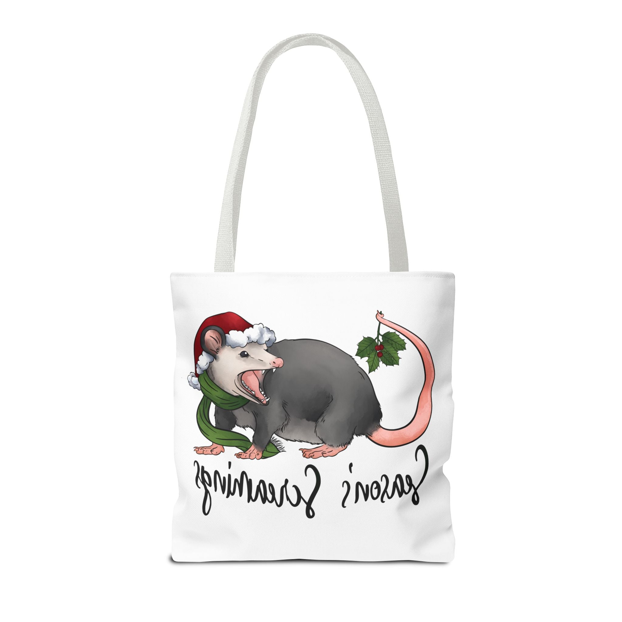 Carry a little holiday mischief with you: a soft, durable tote printed with a cheeky possum in a Santa hat clutching mistletoe and letting out a dramatic squeal. The illustration feels playful and slightly rebellious — the kind of piece that sparks laughs when it peeks out of a market basket or hangs from a coat hook. Lightweight but sturdy, this tote moves from grocery runs to caroling nights with ease. It’s for folks who love offbeat seasonal humor and want a functional bag that reflects their personality. The roomy boxed corners and reinforced handles mean it holds more than just good cheer; it’s built to be used, washed, and adored season after season.