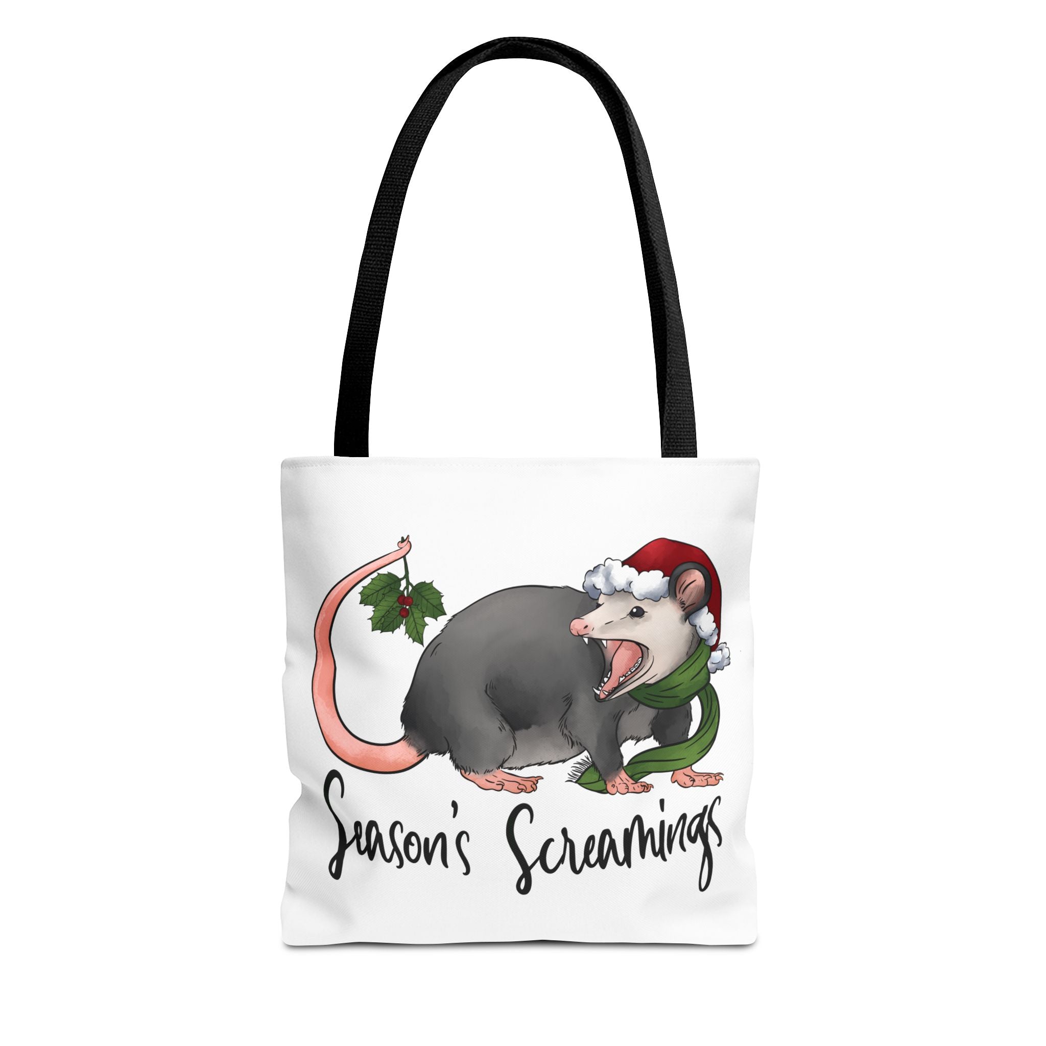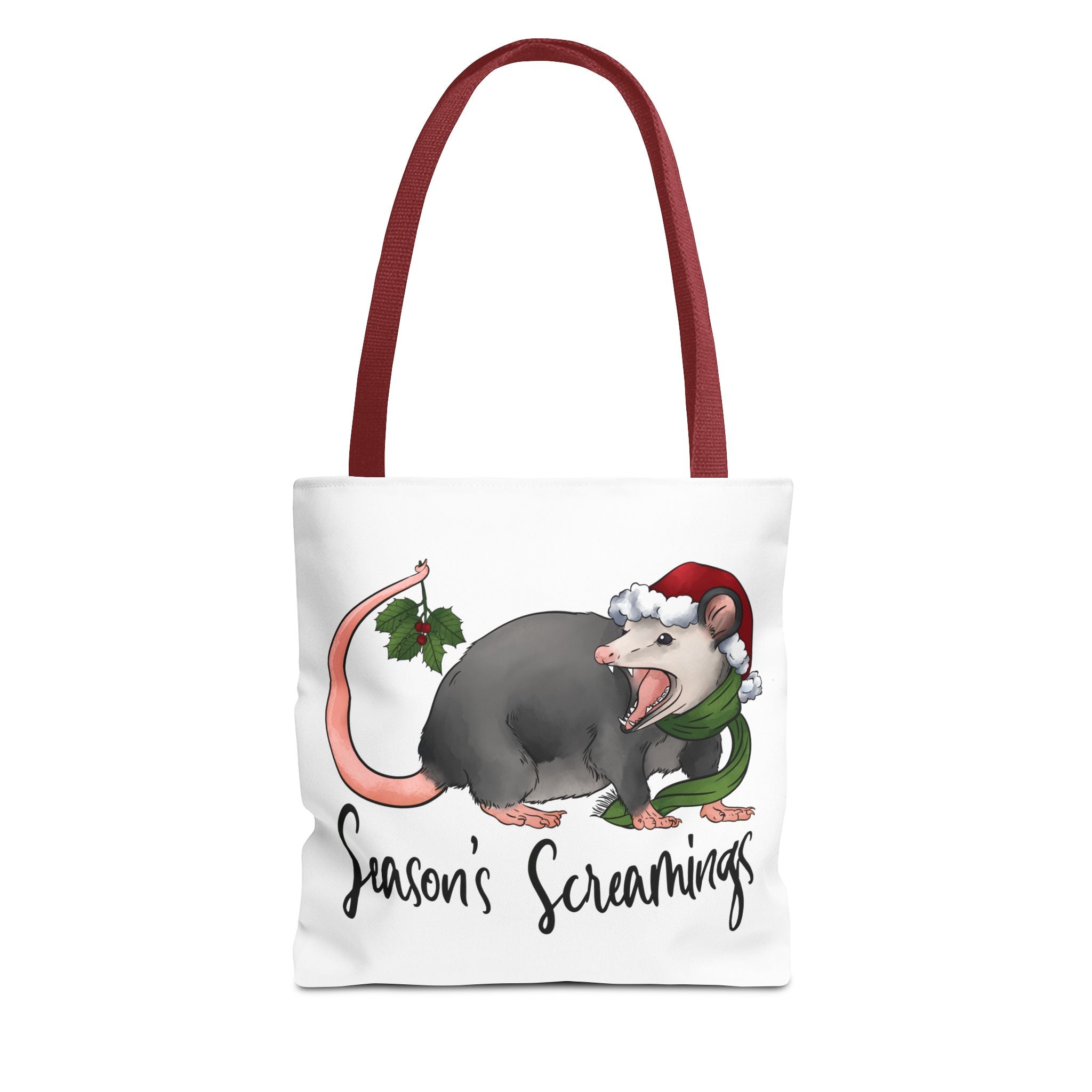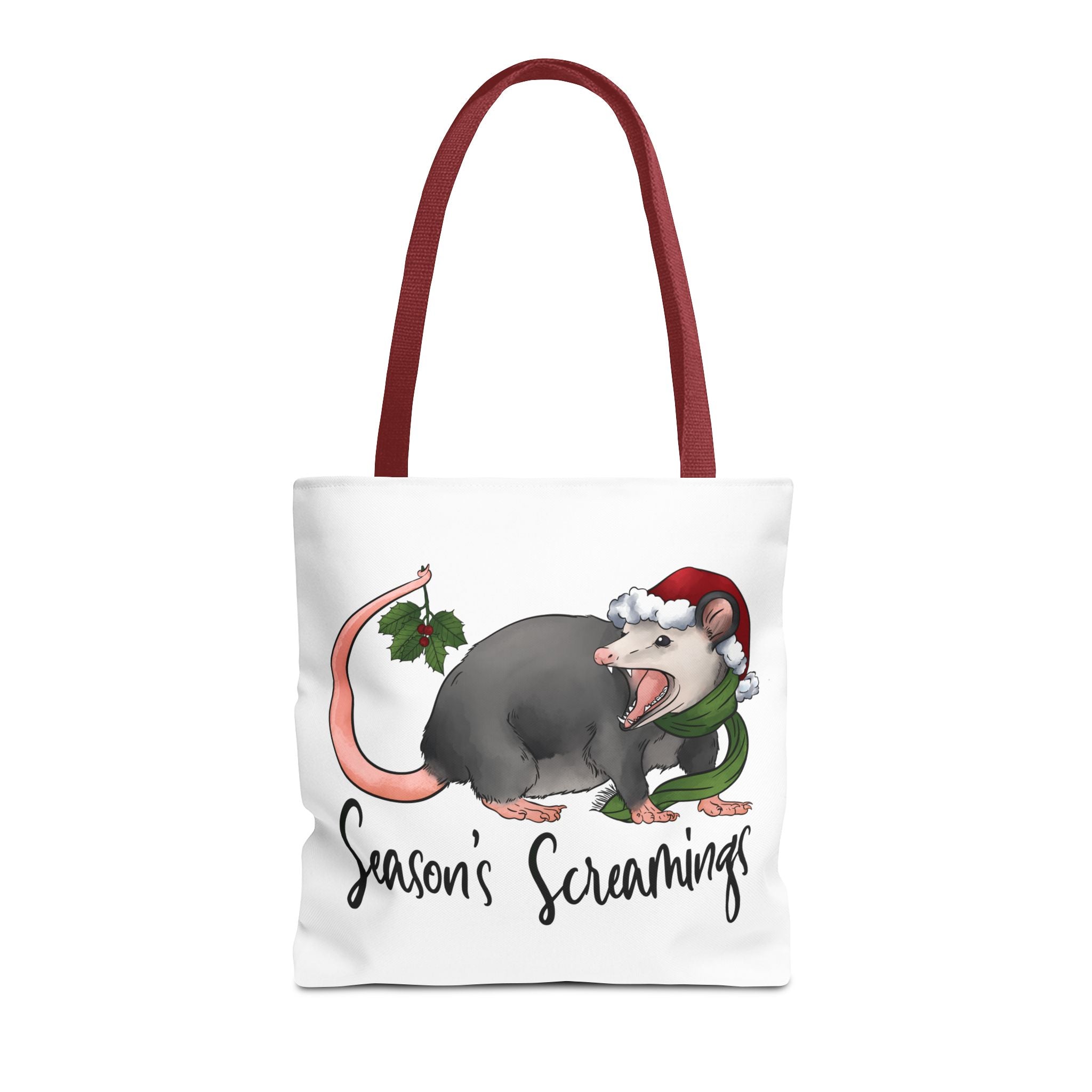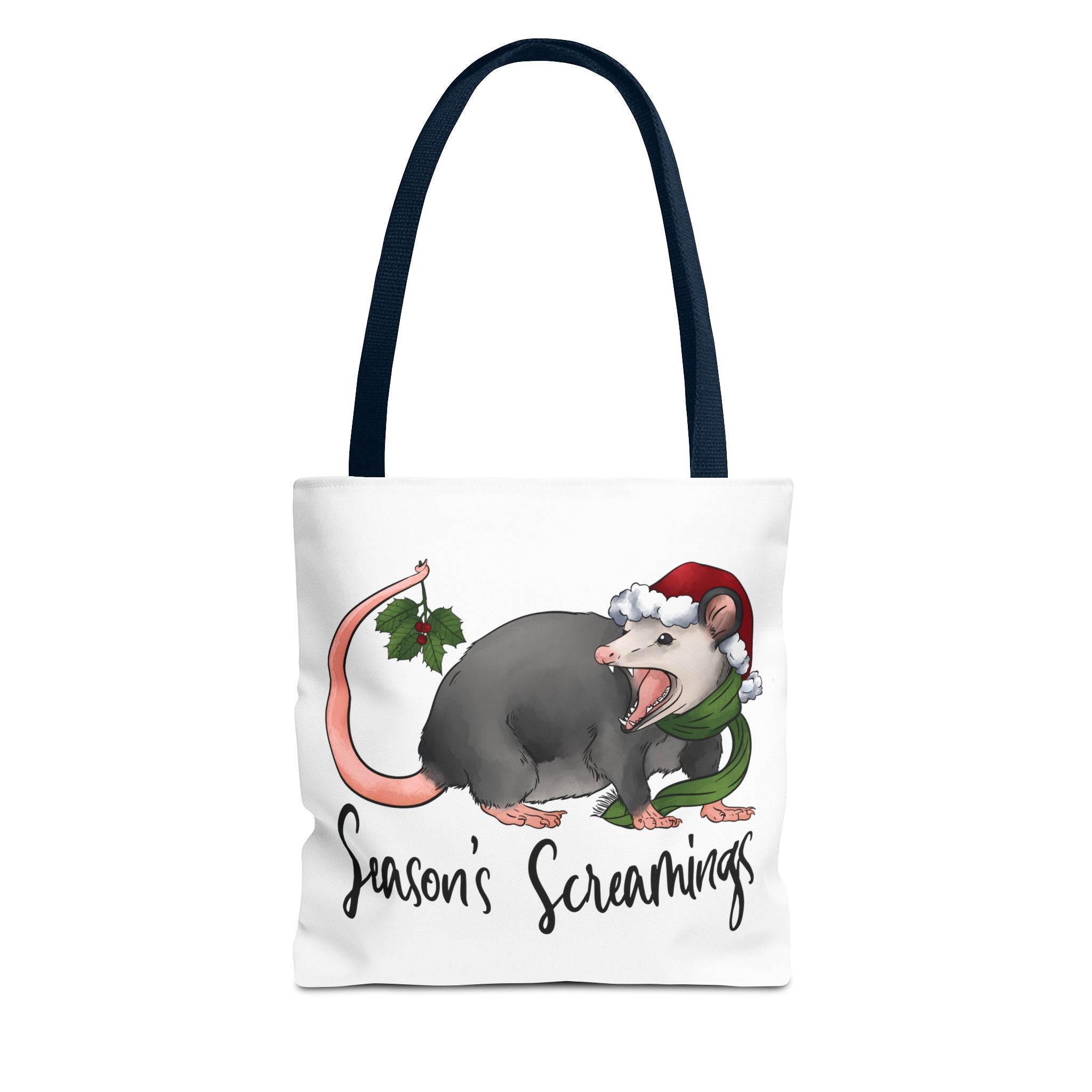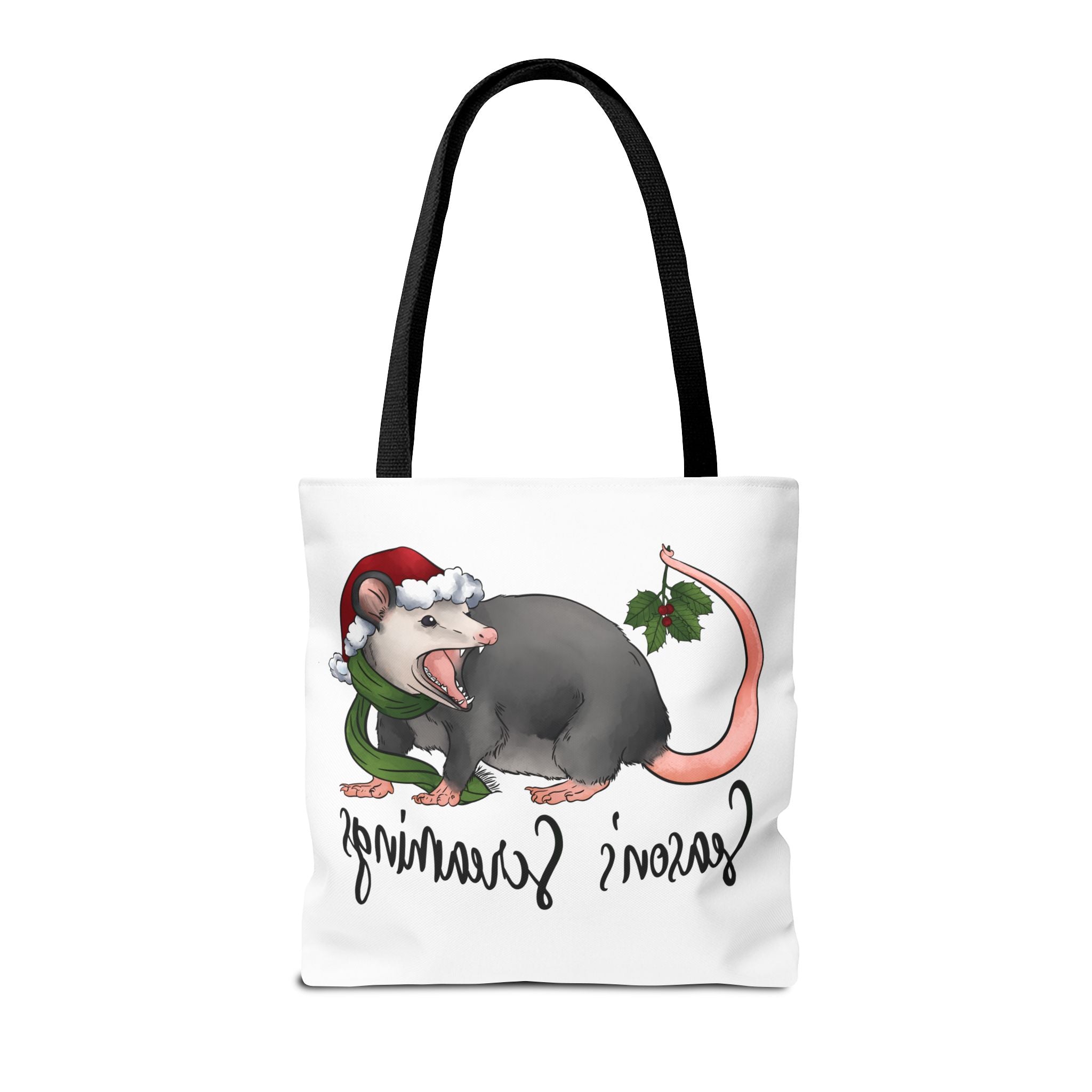 Carry a little holiday mischief with you: a soft, durable tote printed with a cheeky possum in a Santa hat clutching mistletoe and letting out a dramatic squeal. The illustration feels playful and slightly rebellious — the kind of piece that sparks laughs when it peeks out of a market basket or hangs from a coat hook. Lightweight but sturdy, this tote moves from grocery runs to caroling nights with ease. It’s for folks who love offbeat seasonal humor and want a functional bag that reflects their personality. The roomy boxed corners and reinforced handles mean it holds more than just good cheer; it’s built to be used, washed, and adored season after season.