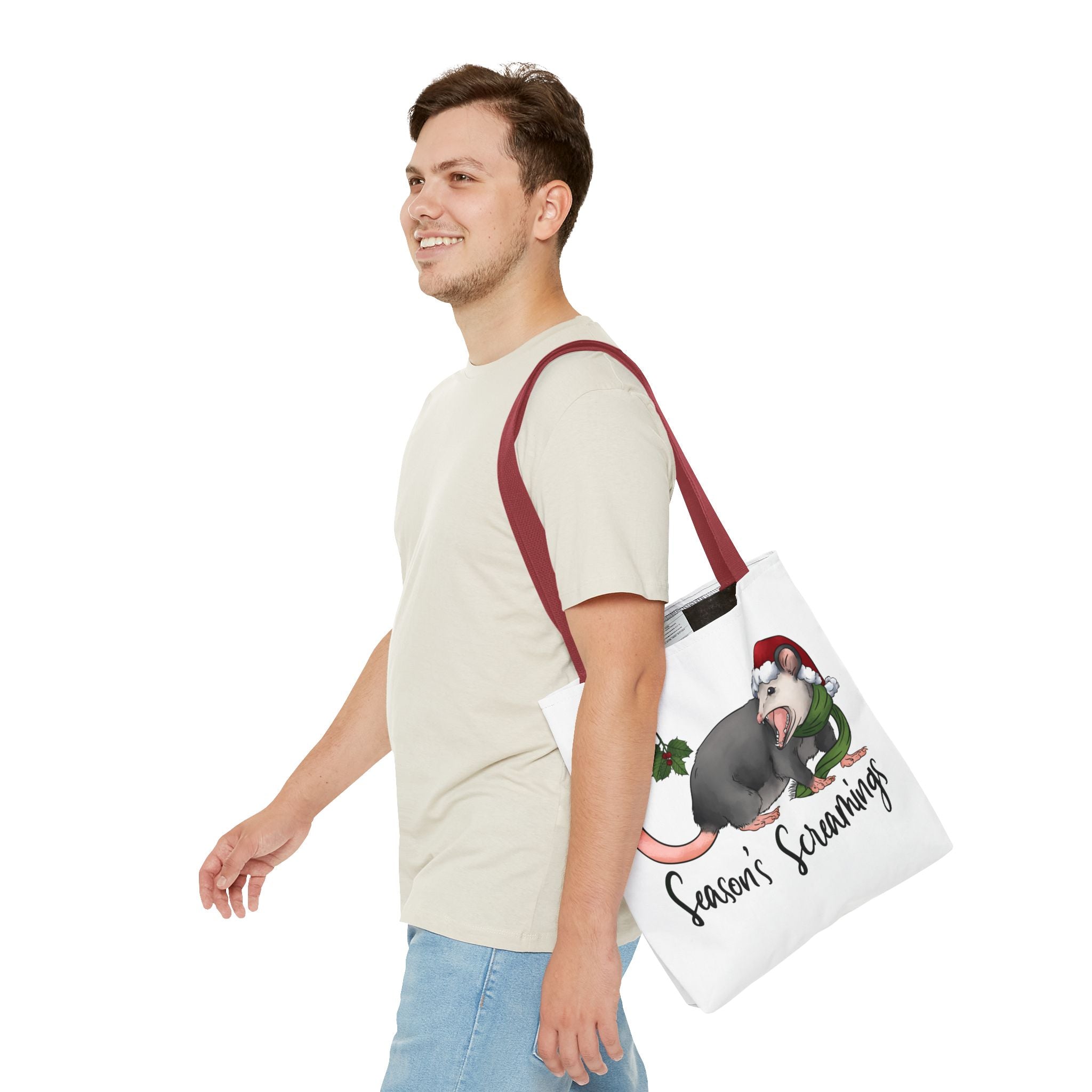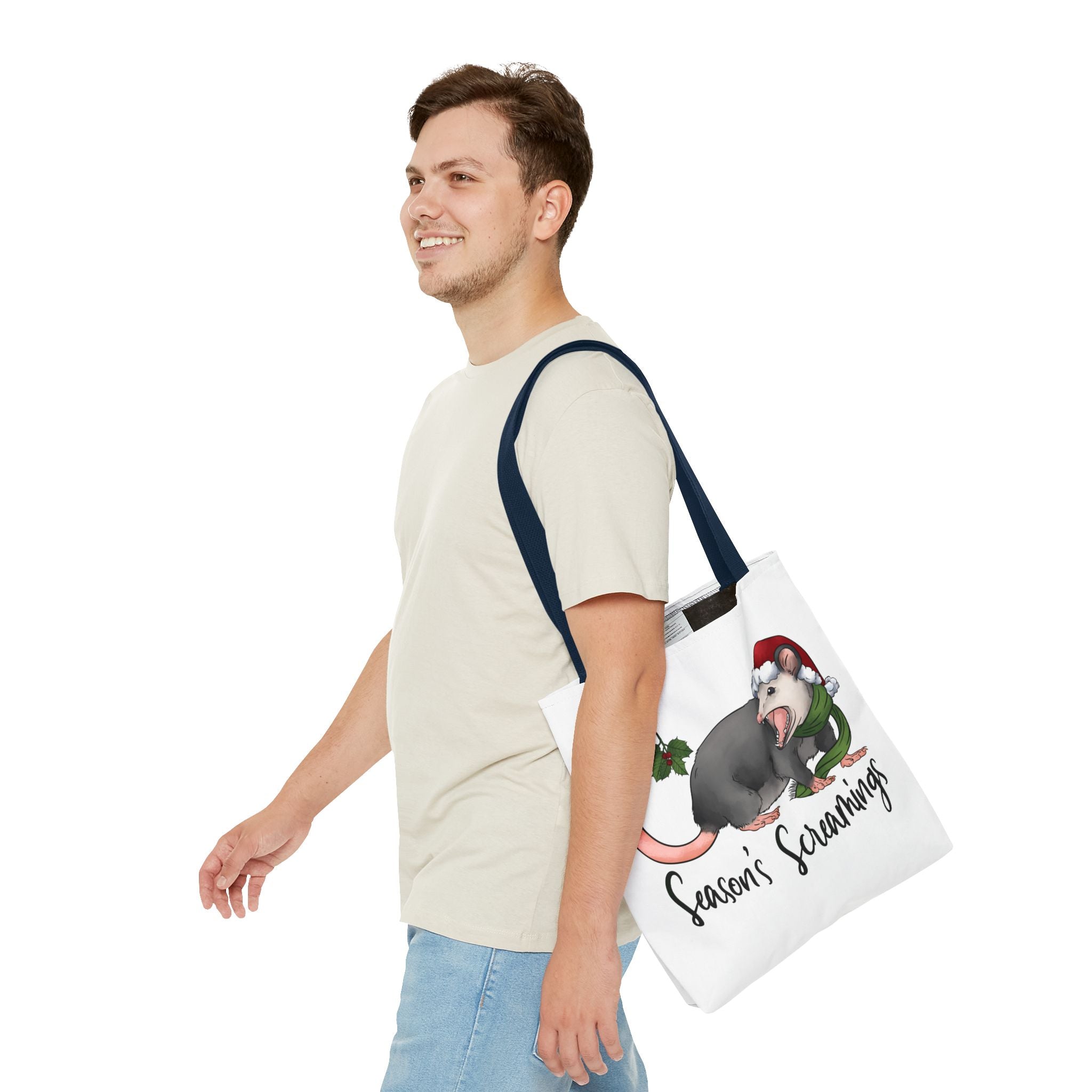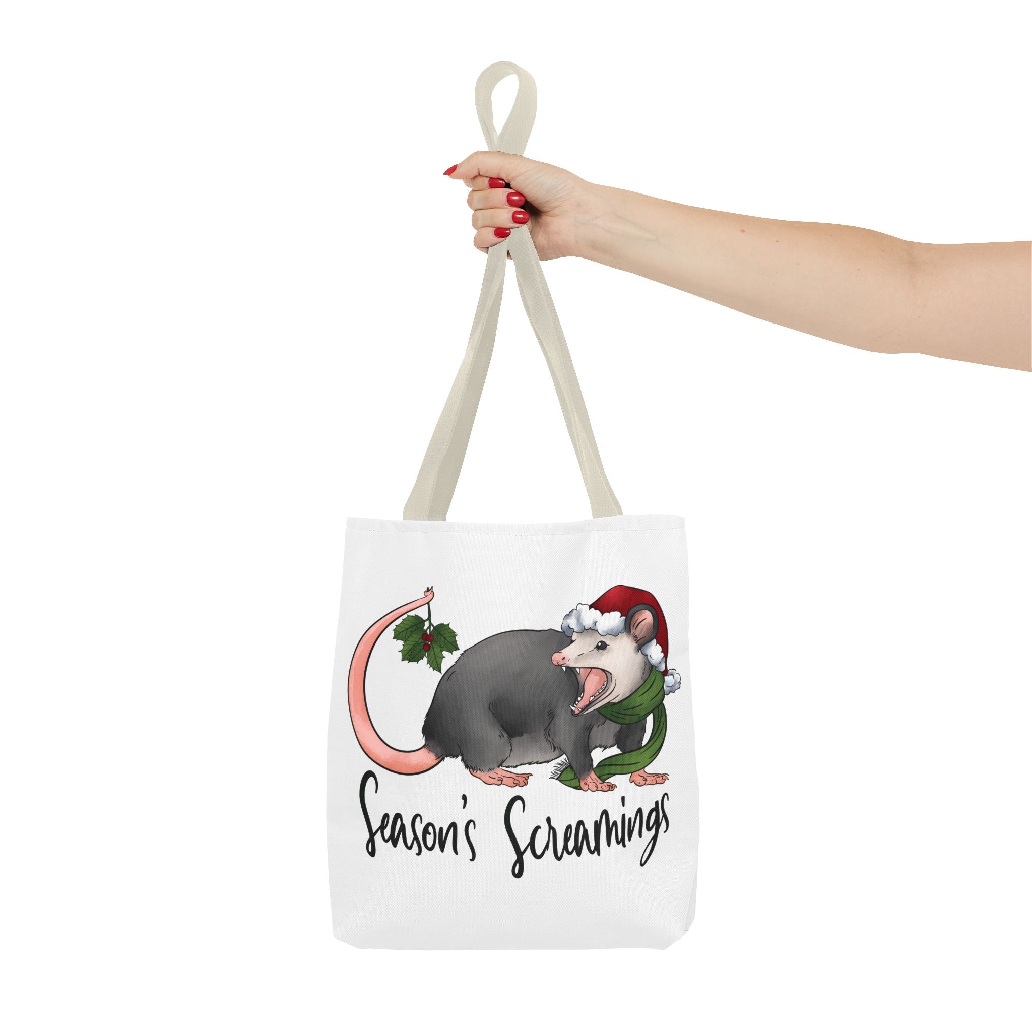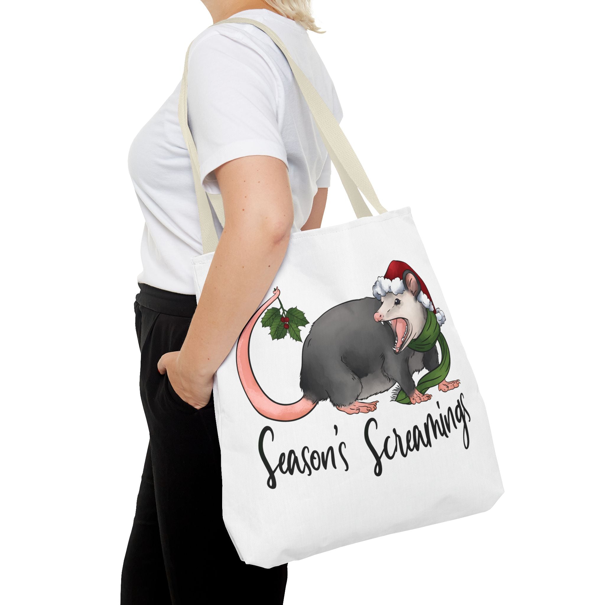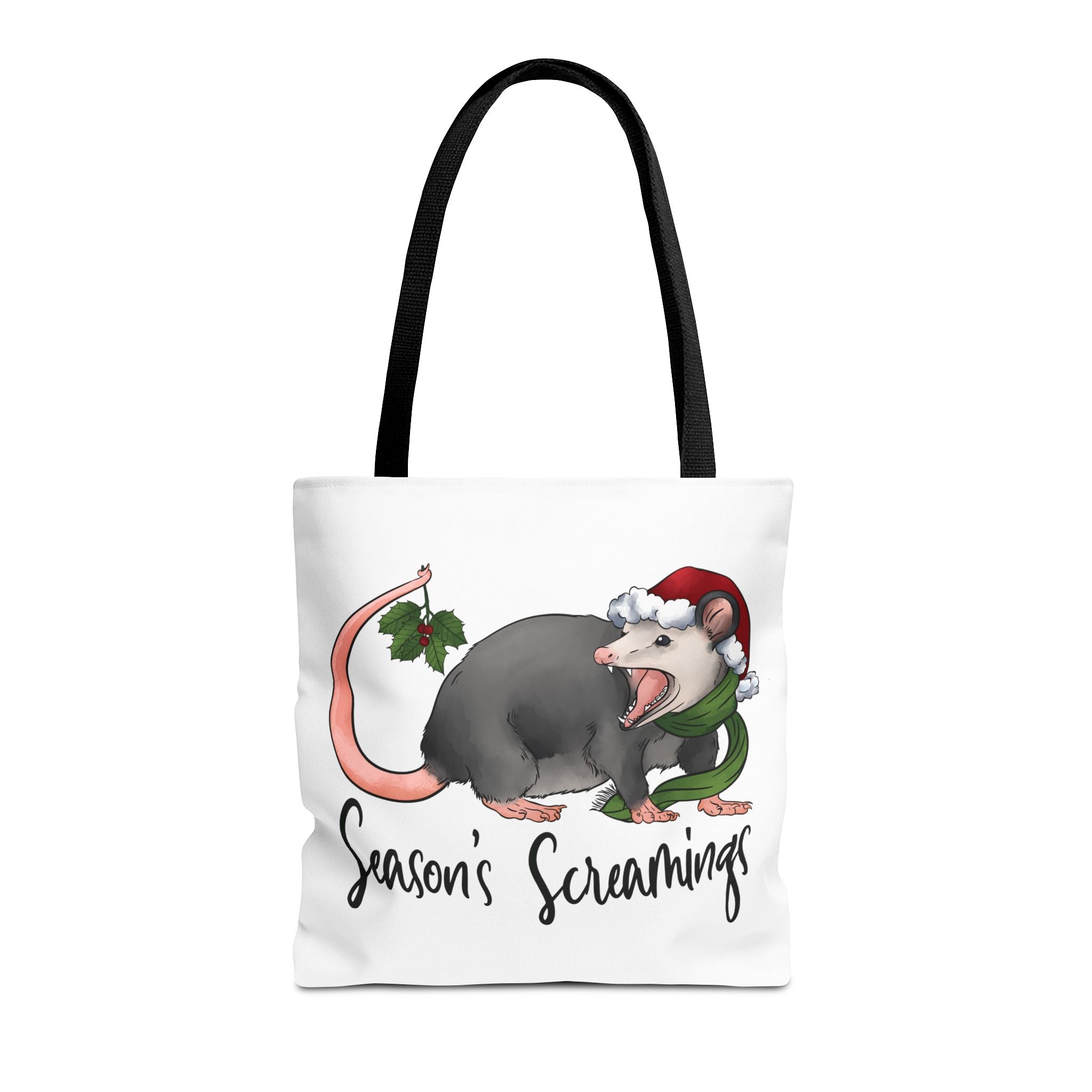 Carry a little holiday mischief with you: a soft, durable tote printed with a cheeky possum in a Santa hat clutching mistletoe and letting out a dramatic squeal. The illustration feels playful and slightly rebellious — the kind of piece that sparks laughs when it peeks out of a market basket or hangs from a coat hook. Lightweight but sturdy, this tote moves from grocery runs to caroling nights with ease. It’s for folks who love offbeat seasonal humor and want a functional bag that reflects their personality. The roomy boxed corners and reinforced handles mean it holds more than just good cheer; it’s built to be used, washed, and adored season after season.