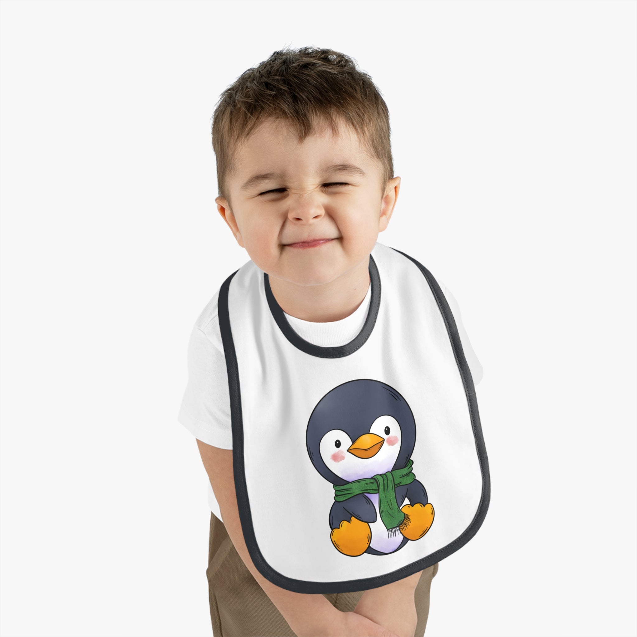Soft, simple, and quietly cheerful — this baby bib feels like a cozy pause in a busy day. The contrast trim frames an adorable penguin illustration, turning mealtime into a moment of smile-worthy warmth. Lightweight but sturdy, the cotton body soaks up spills while the reinforced Velcro keeps the bib in place through wiggles and reaches. It sits gently at the neck and wipes clean easily, making it a small, thoughtful piece of everyday care that parents reach for again and again.