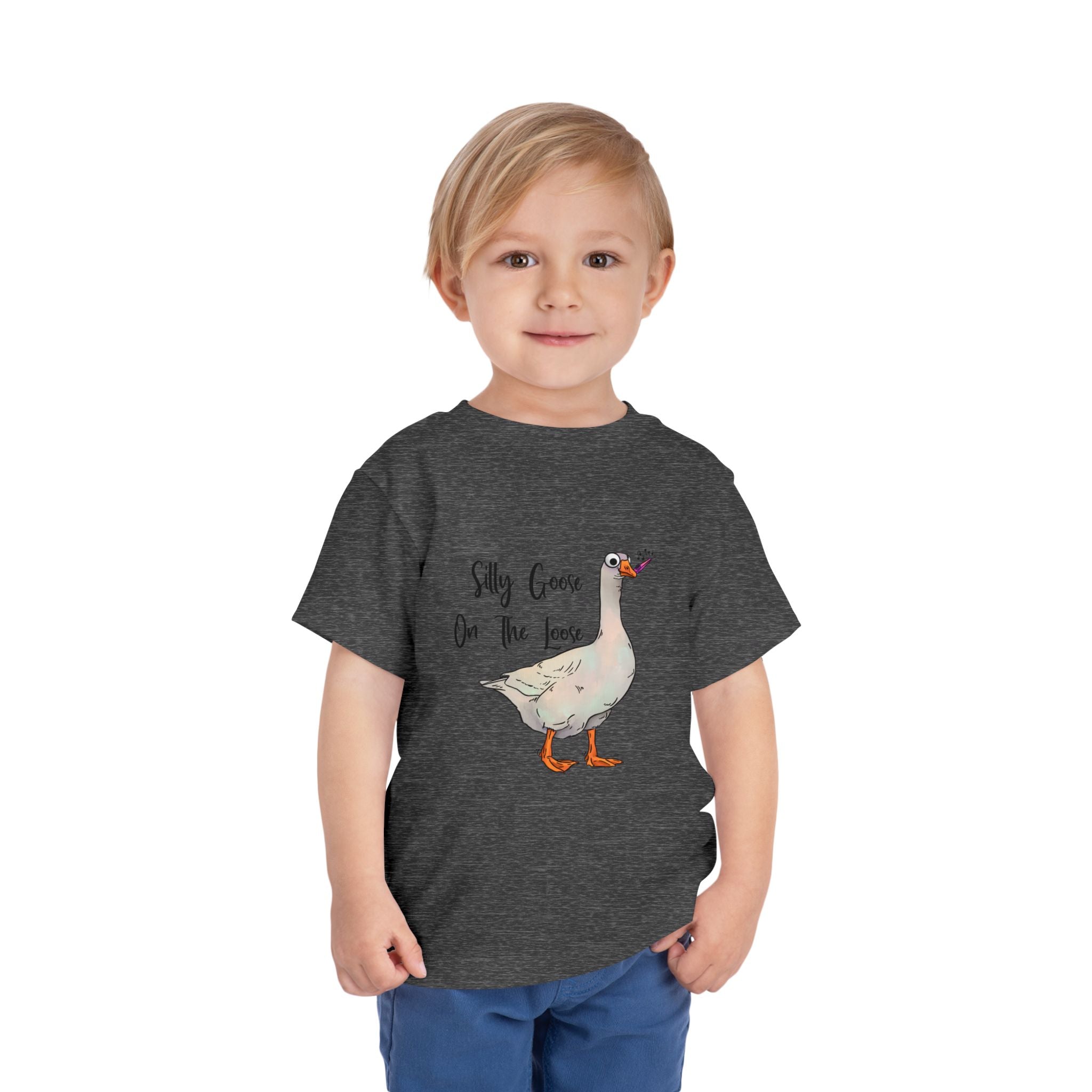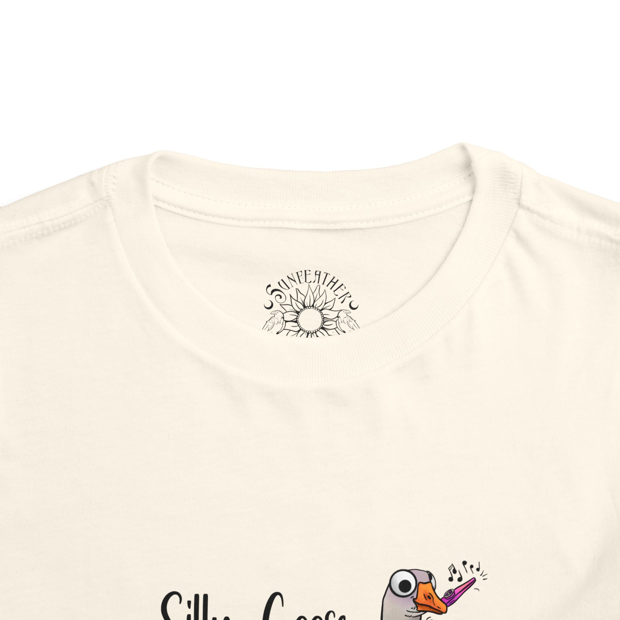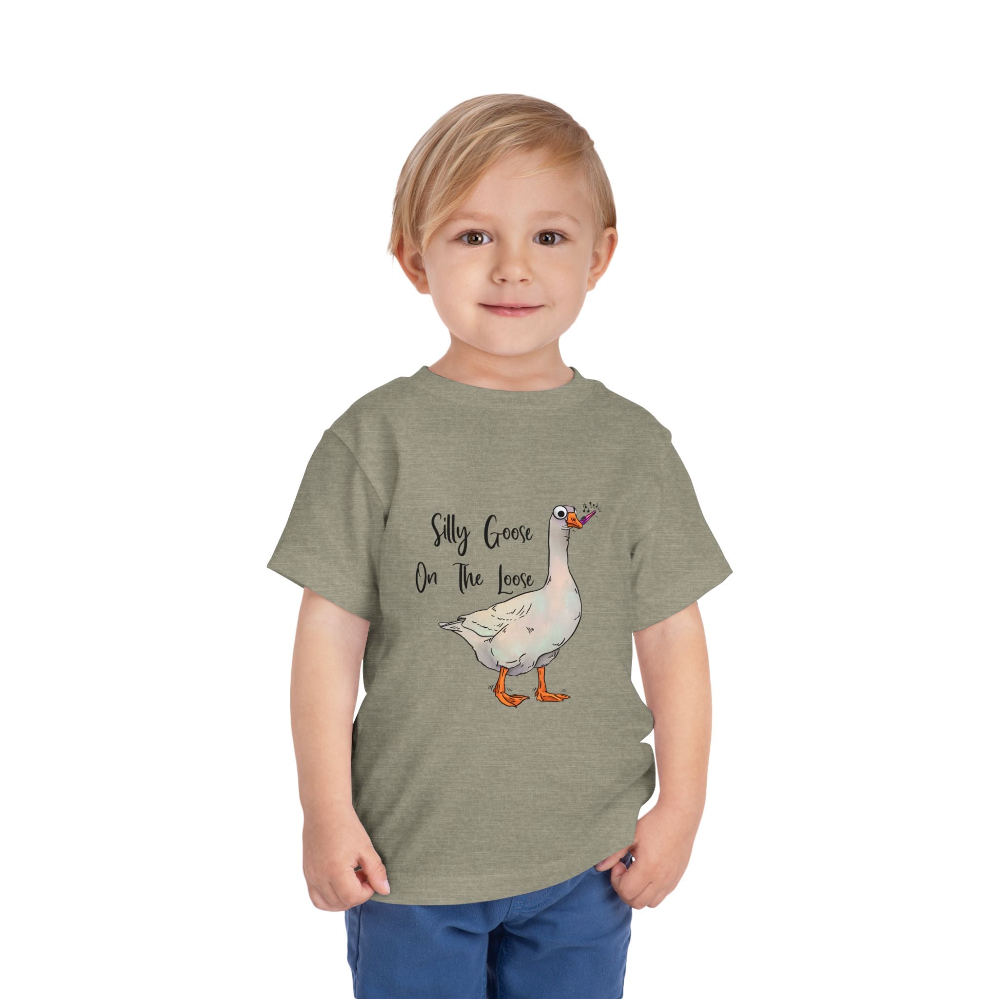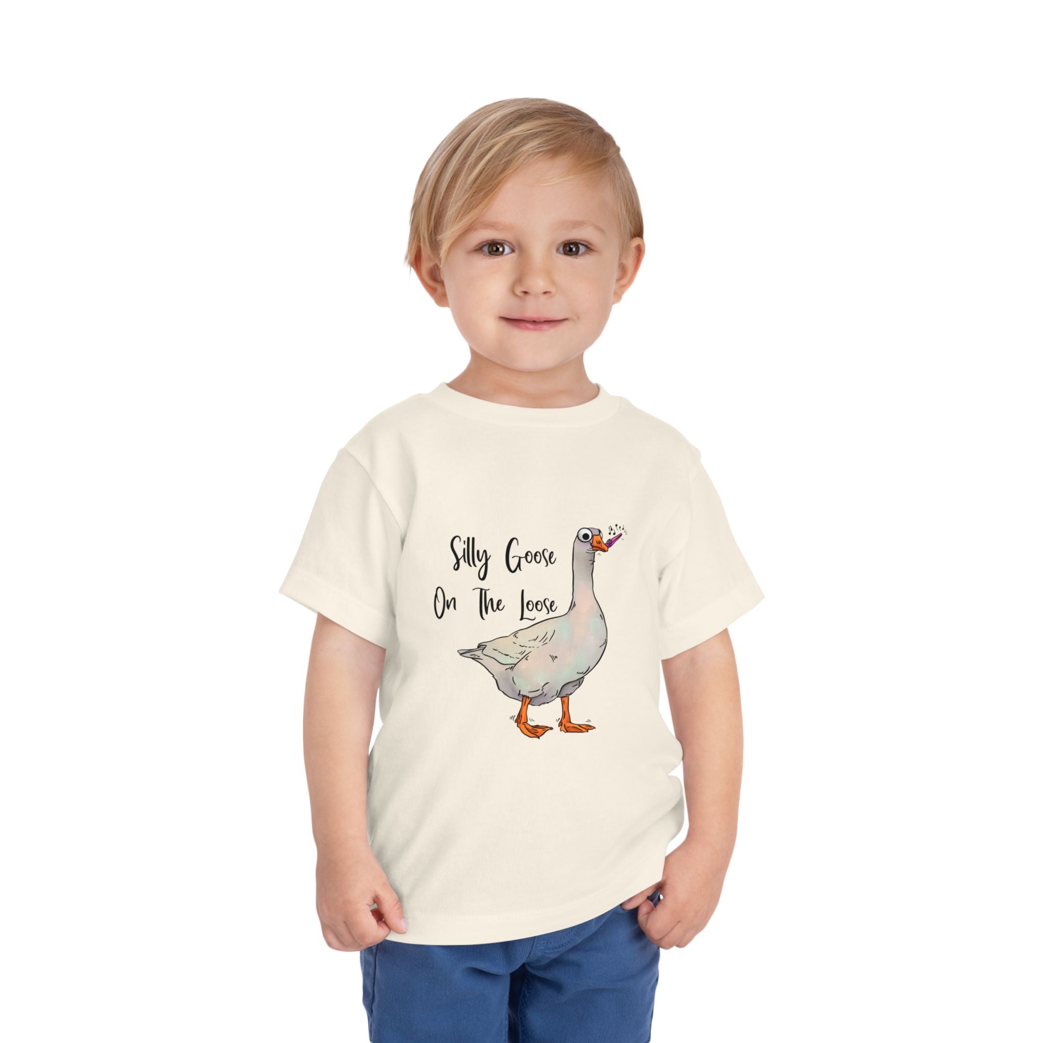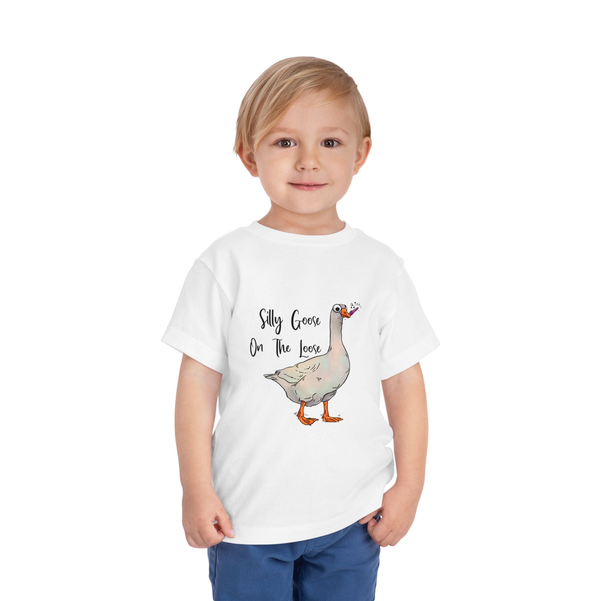 Let this playful toddler tee bring a little mischief and countryside charm to everyday wear. A hand-drawn goose, soft watercolor tones, and the cheeky line “Silly Goose On The Loose” sit gently on a lightweight white tee — easy for layering under a cardigan or pairing with play pants. The feel is airy and breathable so little explorers stay comfortable during rambles, storytime, and puddle-jumping. The simple back keeps the focus on the sweet illustration, while the tear-away label keeps naps and squabbles fuss-free. This shirt reads like a tiny storybook moment: a sunny morning, a curious gosling, and the kind of laughter that comes from small, unexpected adventures.