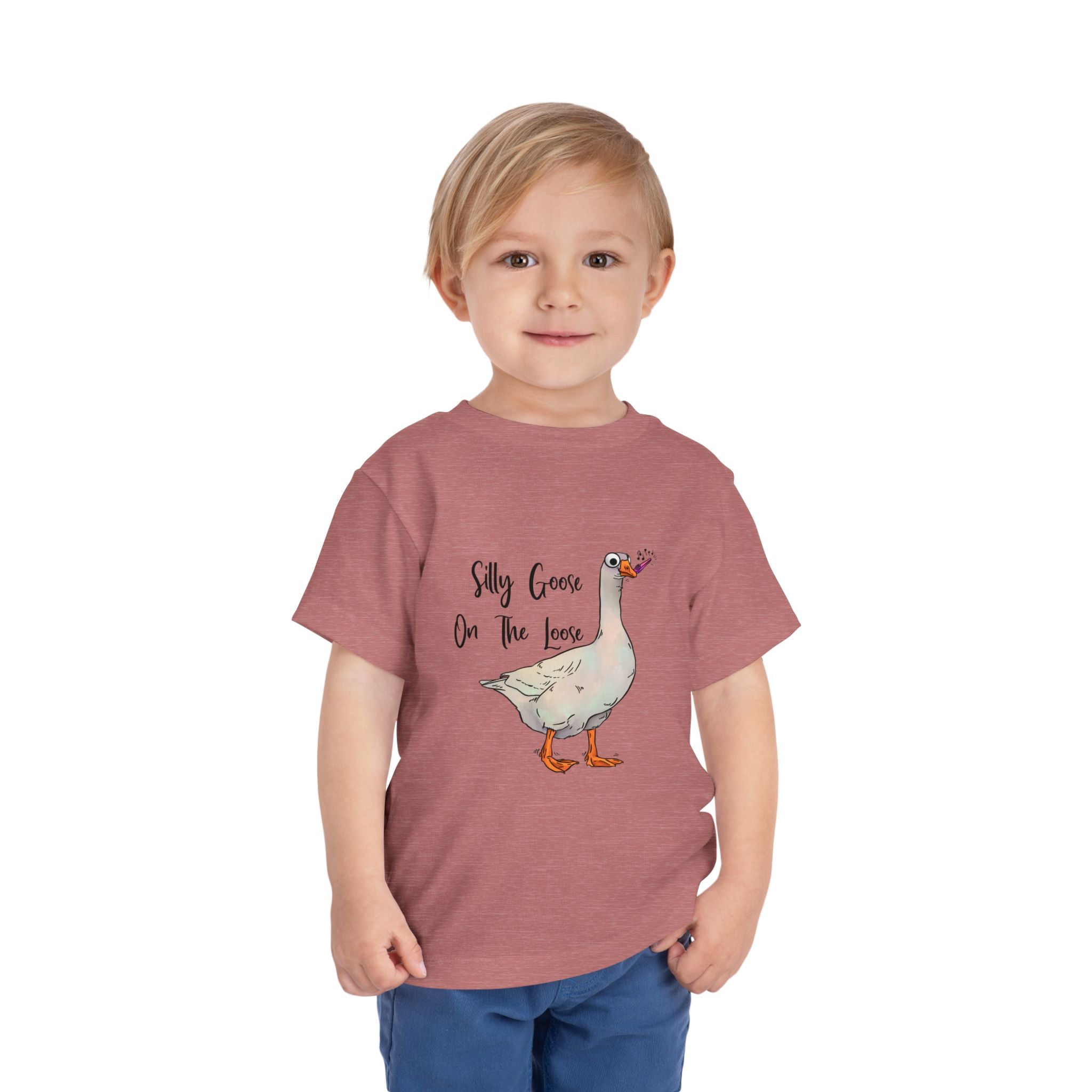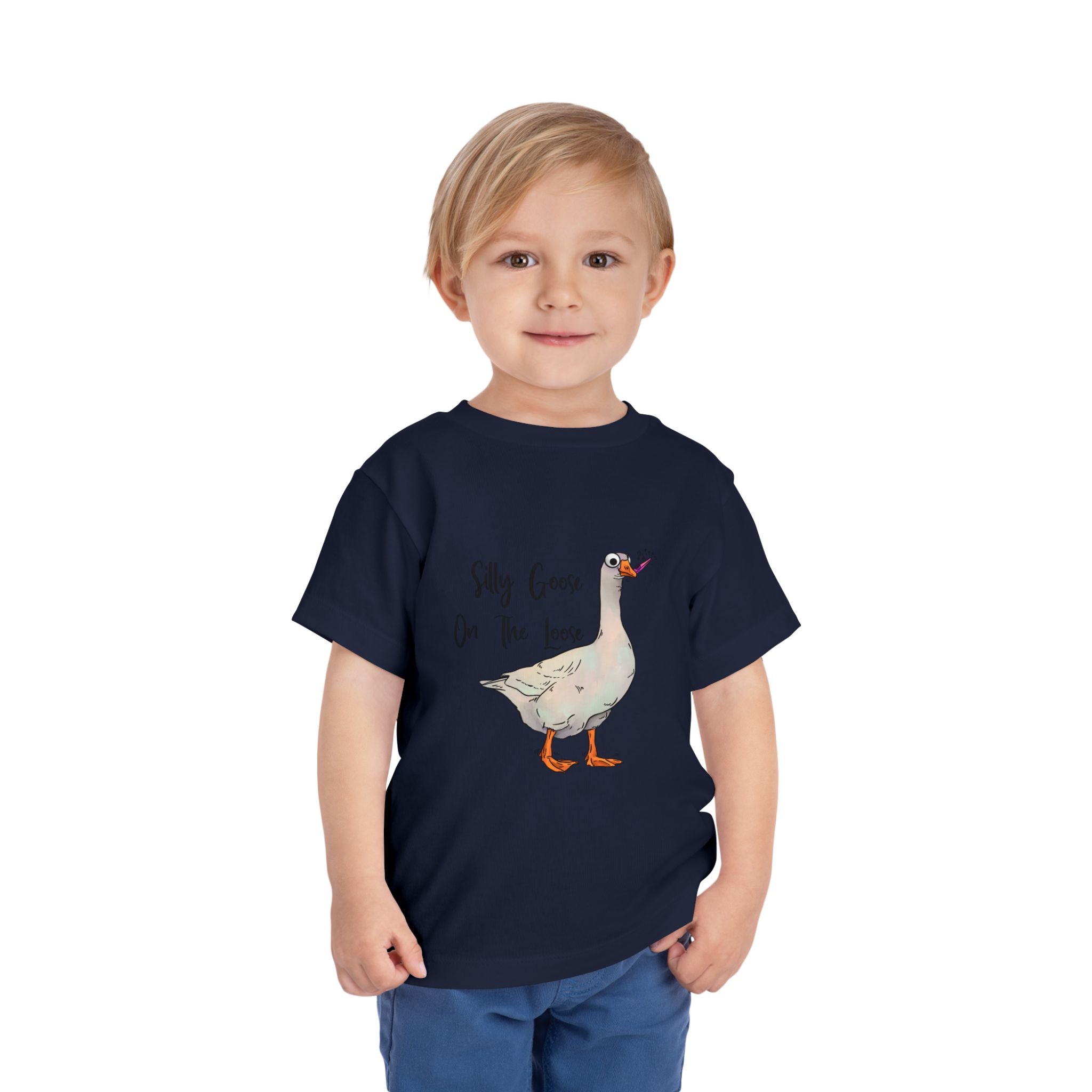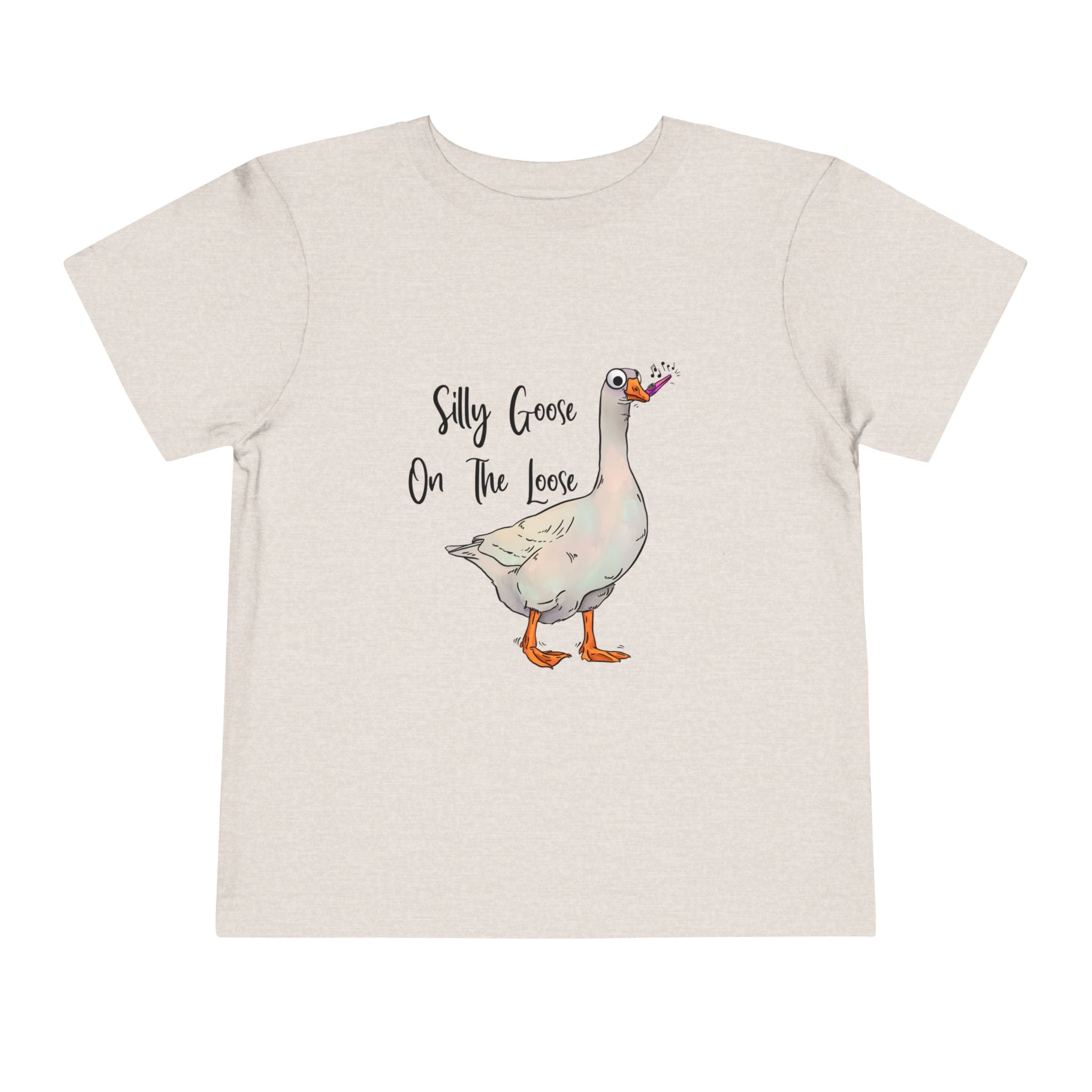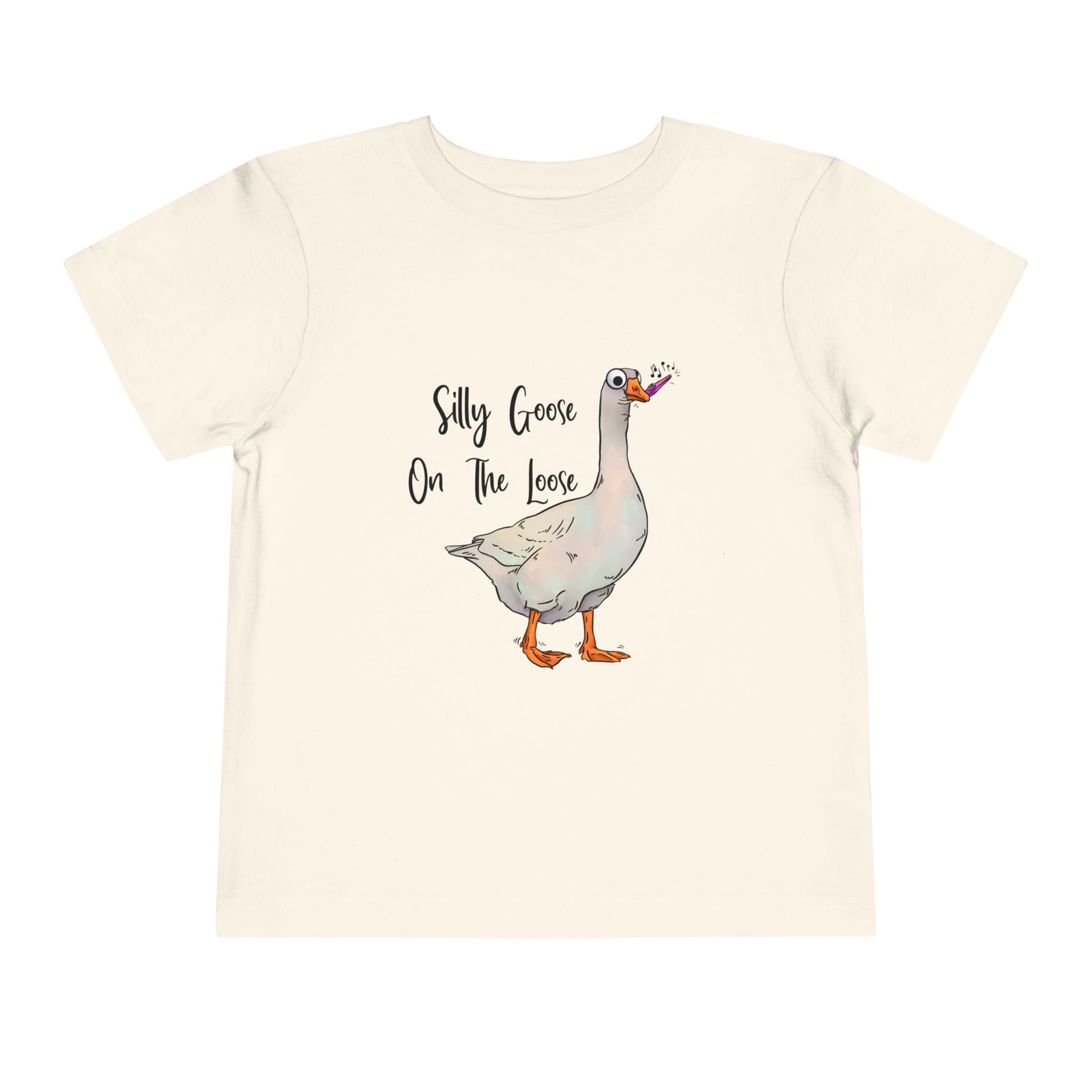 Let this playful toddler tee bring a little mischief and countryside charm to everyday wear. A hand-drawn goose, soft watercolor tones, and the cheeky line “Silly Goose On The Loose” sit gently on a lightweight white tee — easy for layering under a cardigan or pairing with play pants. The feel is airy and breathable so little explorers stay comfortable during rambles, storytime, and puddle-jumping. The simple back keeps the focus on the sweet illustration, while the tear-away label keeps naps and squabbles fuss-free. This shirt reads like a tiny storybook moment: a sunny morning, a curious gosling, and the kind of laughter that comes from small, unexpected adventures.