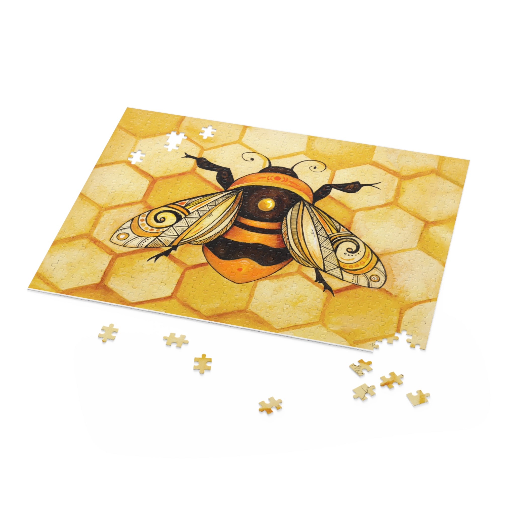 Lose an hour to this warm, honeyed puzzle that feels like sunlight poured into a tabletop. Each piece snaps into a golden honeycomb, revealing a stylized bee with swirl-patterned wings and rich amber tones. Work the edges first, then watch the hexagons lock together like a small handcrafted hive. It’s calming focus for quiet evenings, rainy afternoons, or low-key gatherings where conversation drifts and hands stay busy. For someone who loves nature-inspired art, slow afternoons, and tactile projects, this puzzle becomes a simple ritual — the satisfying click of chipboard, the glossy sheen of finished art, and a finished image that looks ready to hang on the wall.