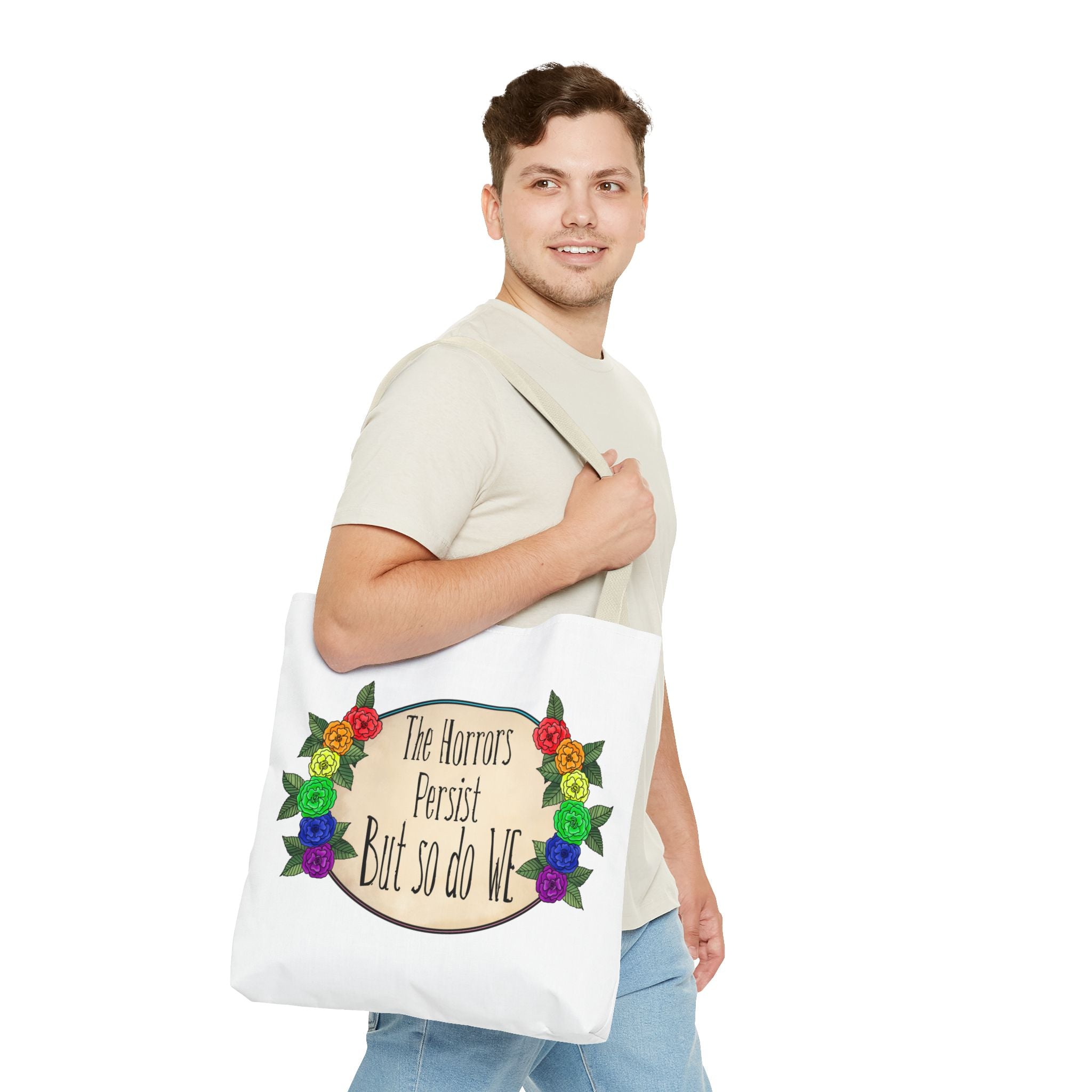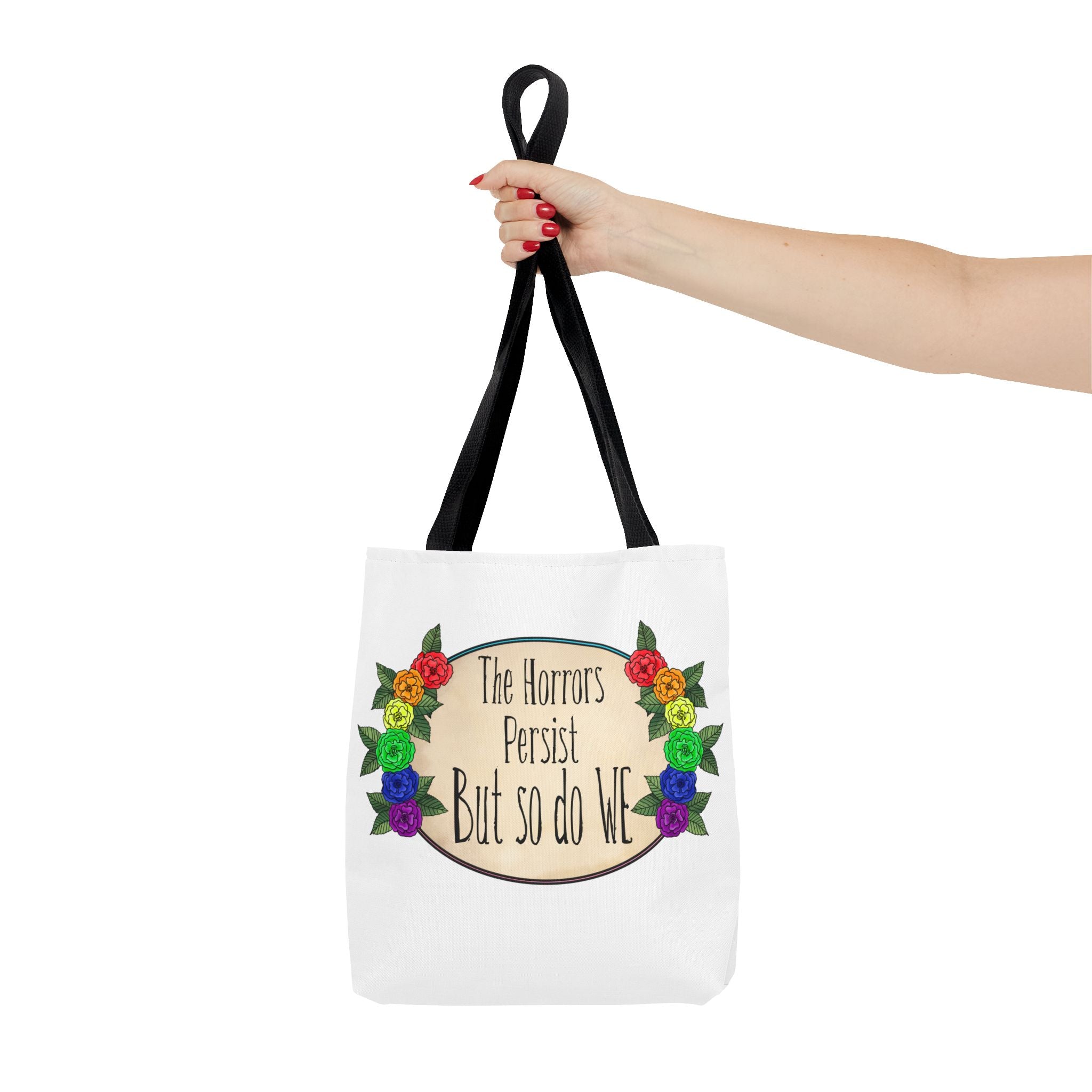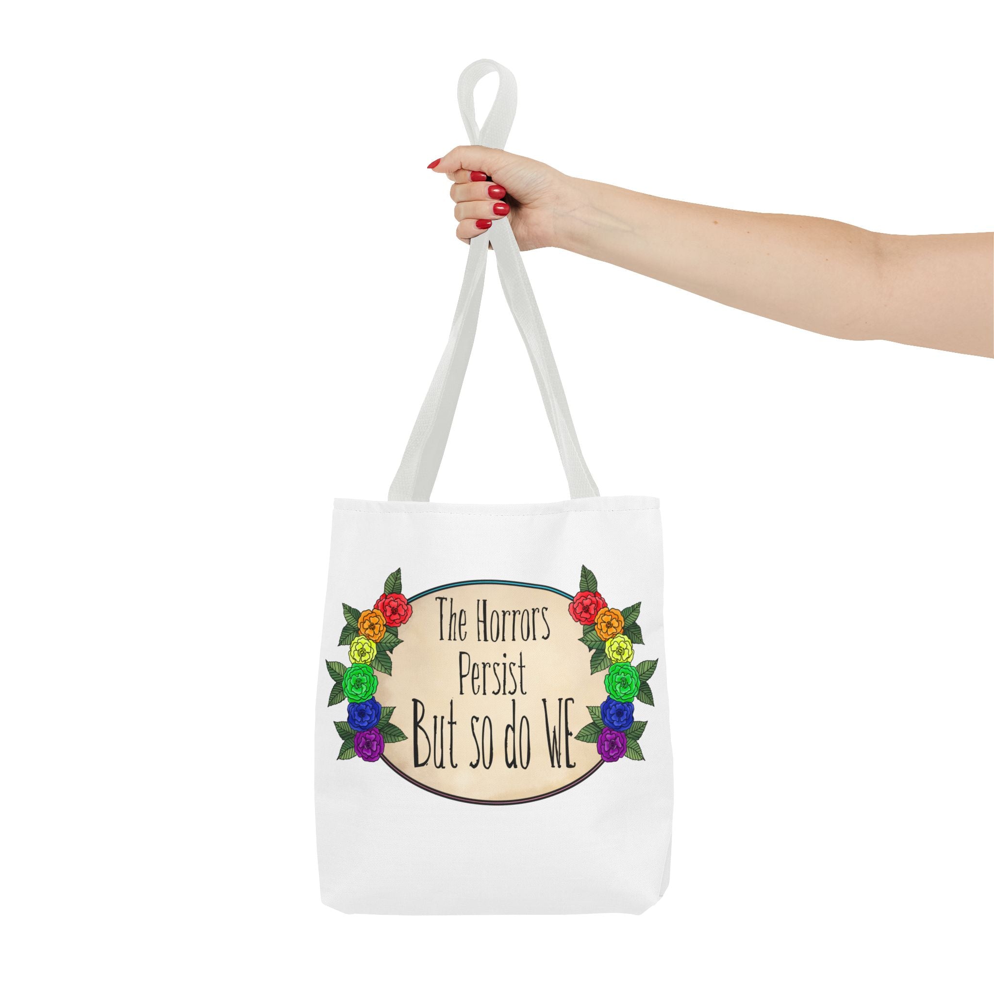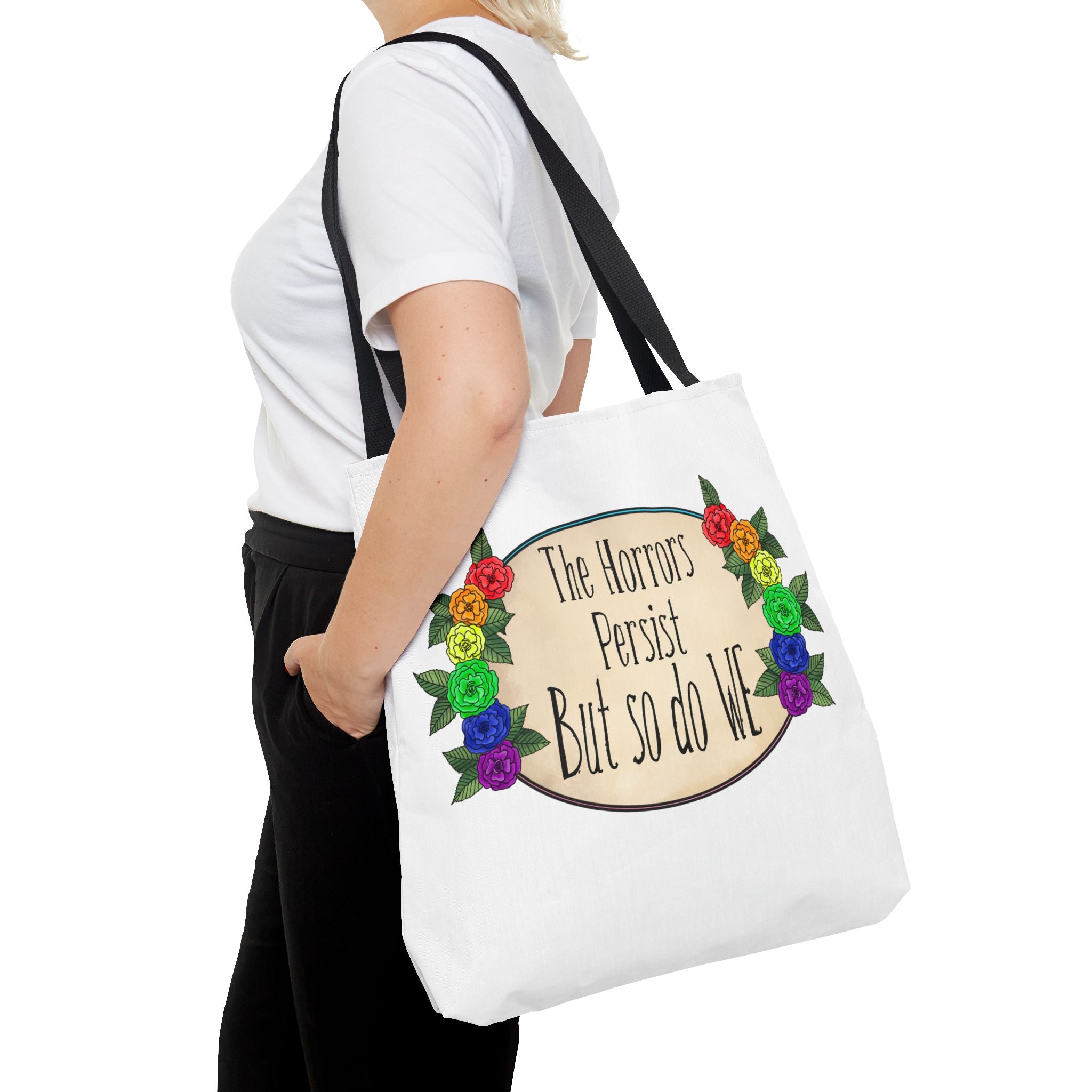 Introducing a beautifully crafted tote bag that seamlessly blends style and functionality. Made from durable polyester, this tote not only adds a pop of color to your outfit but also stands up to daily use. Its vibrant floral design carries a meaningful message, making it a perfect accessory for those who value resilience and positivity. Ideal for everyday errands, grocery shopping, or as a chic carry-all for work or school, this tote bag is relevant to anyone looking to express their individuality. Perfect for holidays, celebrations, or as a thoughtful gift for loved ones, it brings a touch of inspiration to any occasion. So whether you're headed to the beach, a picnic, or just out and about, this tote bag will keep your essentials stylishly organized.