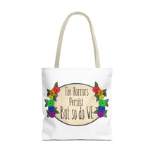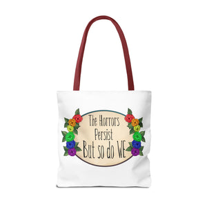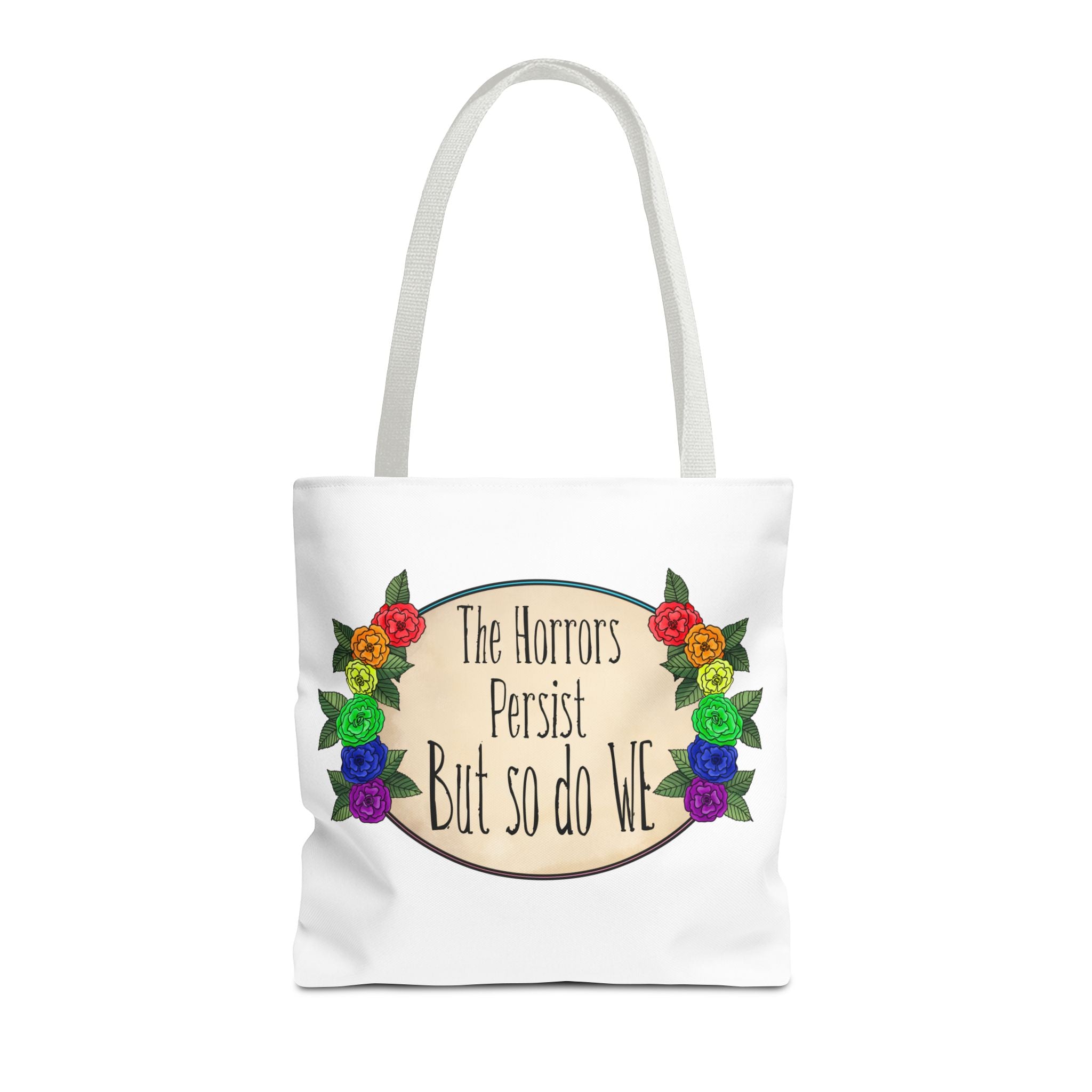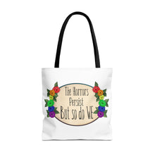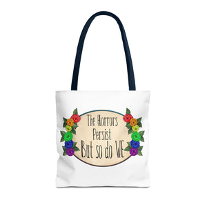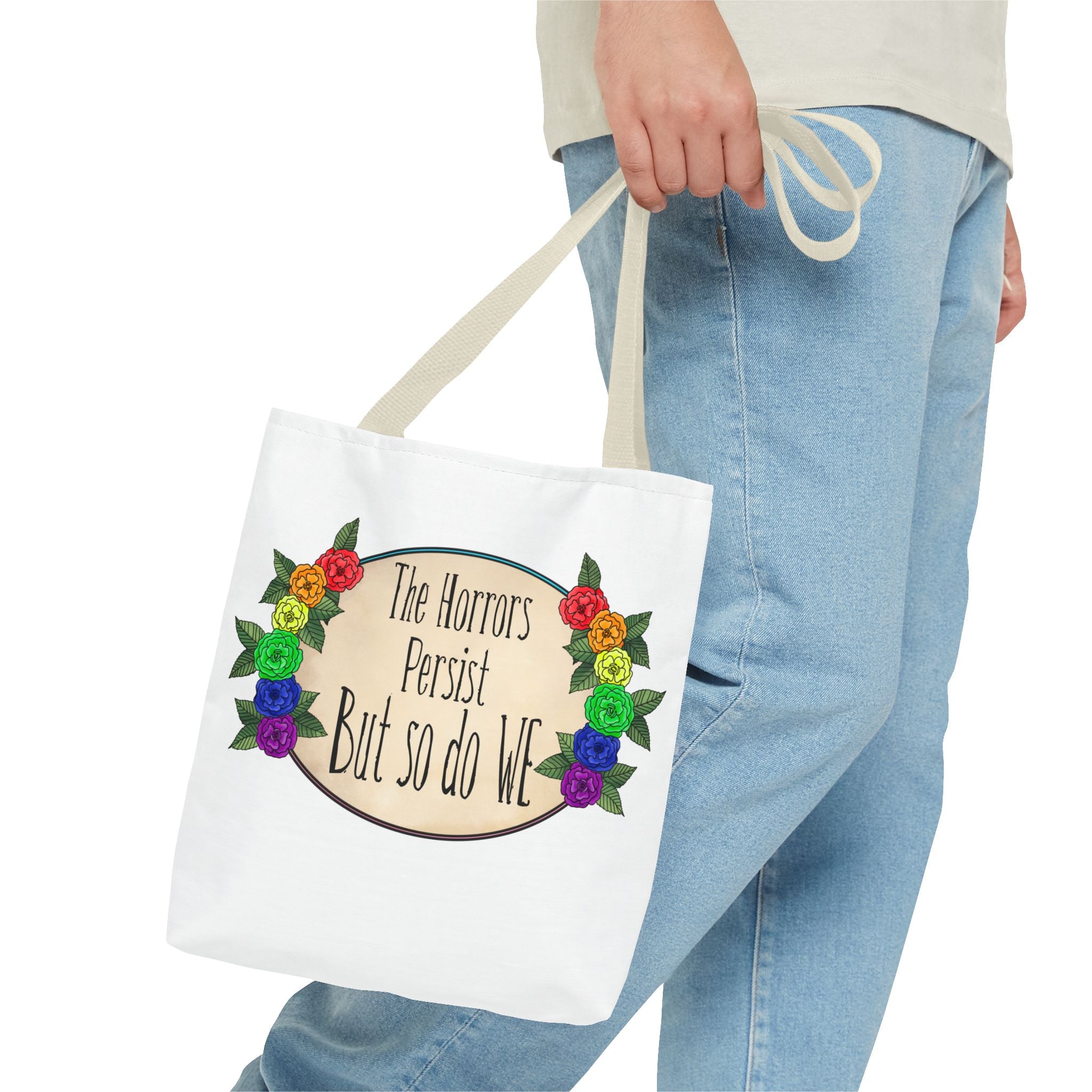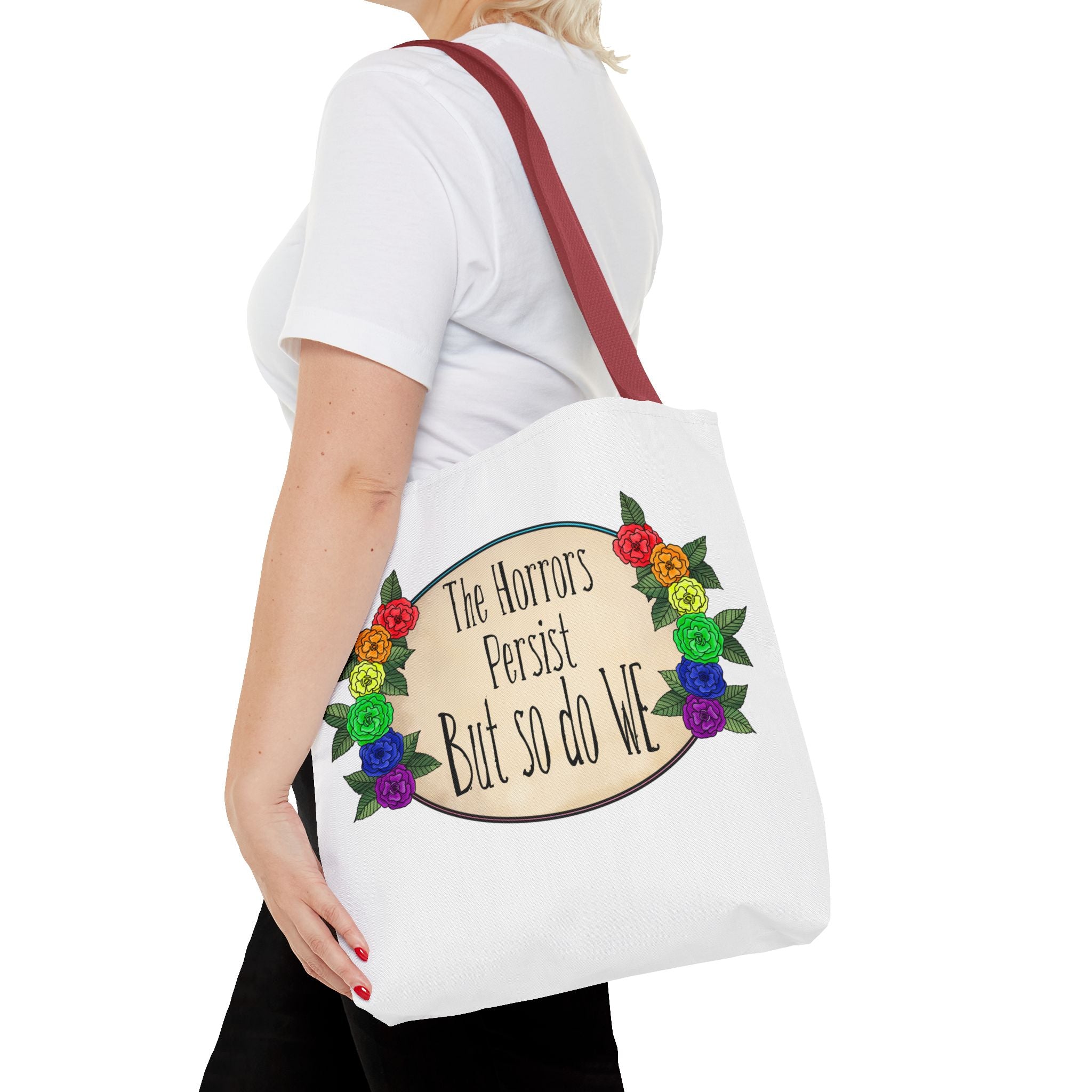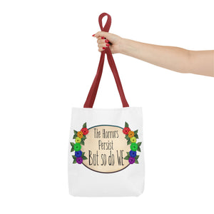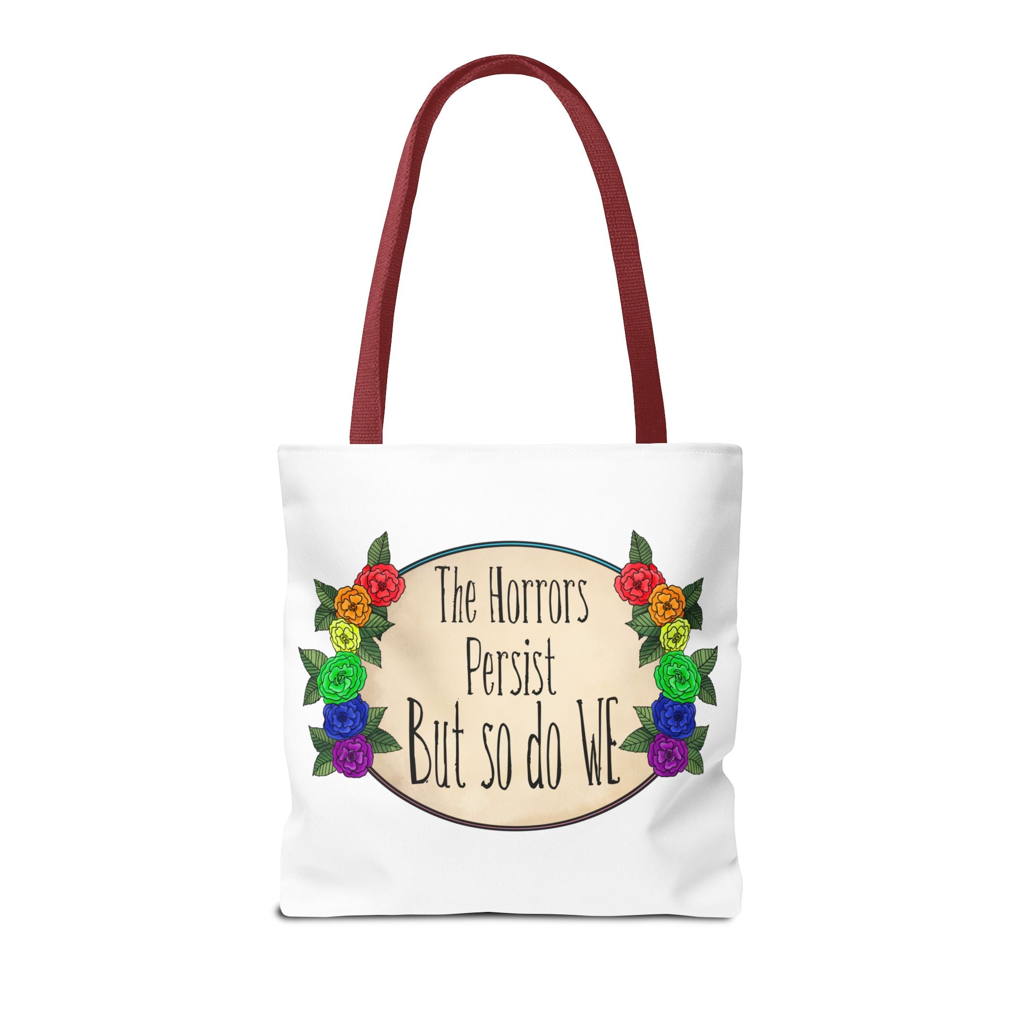 Introducing a beautifully crafted tote bag that seamlessly blends style and functionality. Made from durable polyester, this tote not only adds a pop of color to your outfit but also stands up to daily use. Its vibrant floral design carries a meaningful message, making it a perfect accessory for those who value resilience and positivity. Ideal for everyday errands, grocery shopping, or as a chic carry-all for work or school, this tote bag is relevant to anyone looking to express their individuality. Perfect for holidays, celebrations, or as a thoughtful gift for loved ones, it brings a touch of inspiration to any occasion. So whether you're headed to the beach, a picnic, or just out and about, this tote bag will keep your essentials stylishly organized.