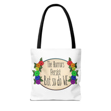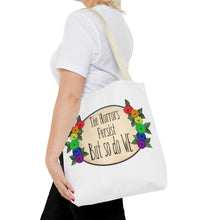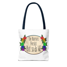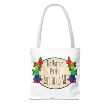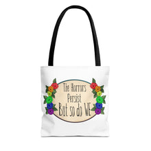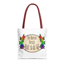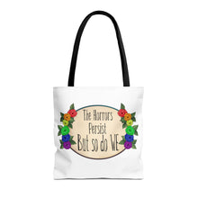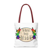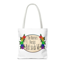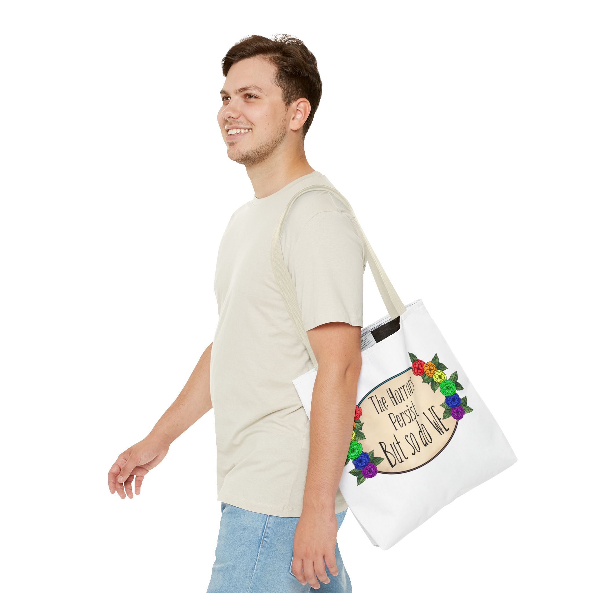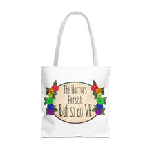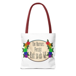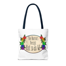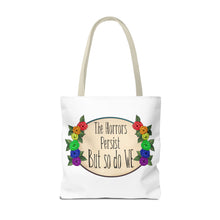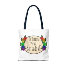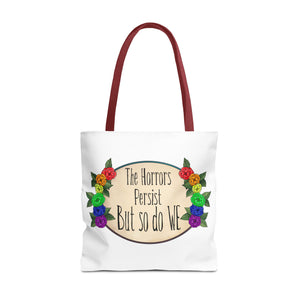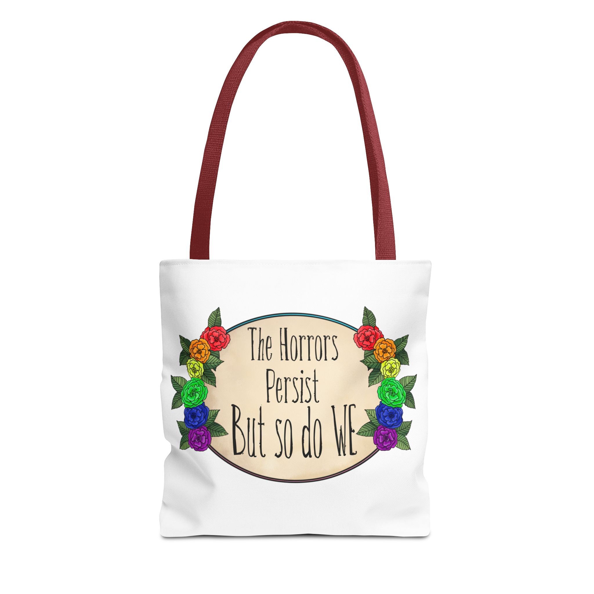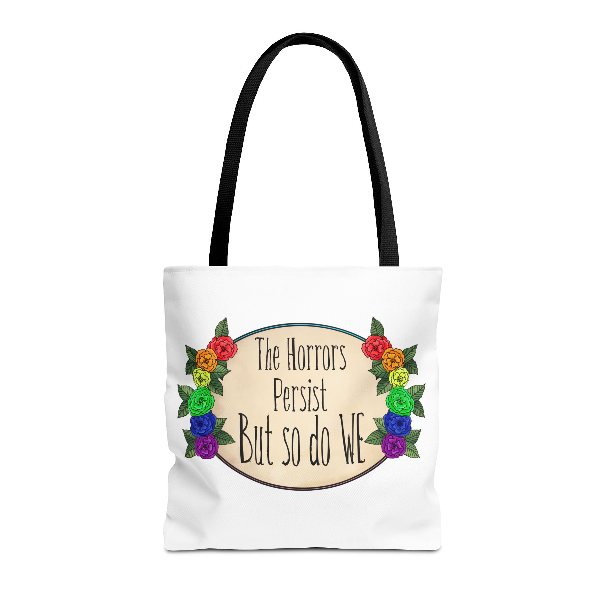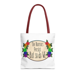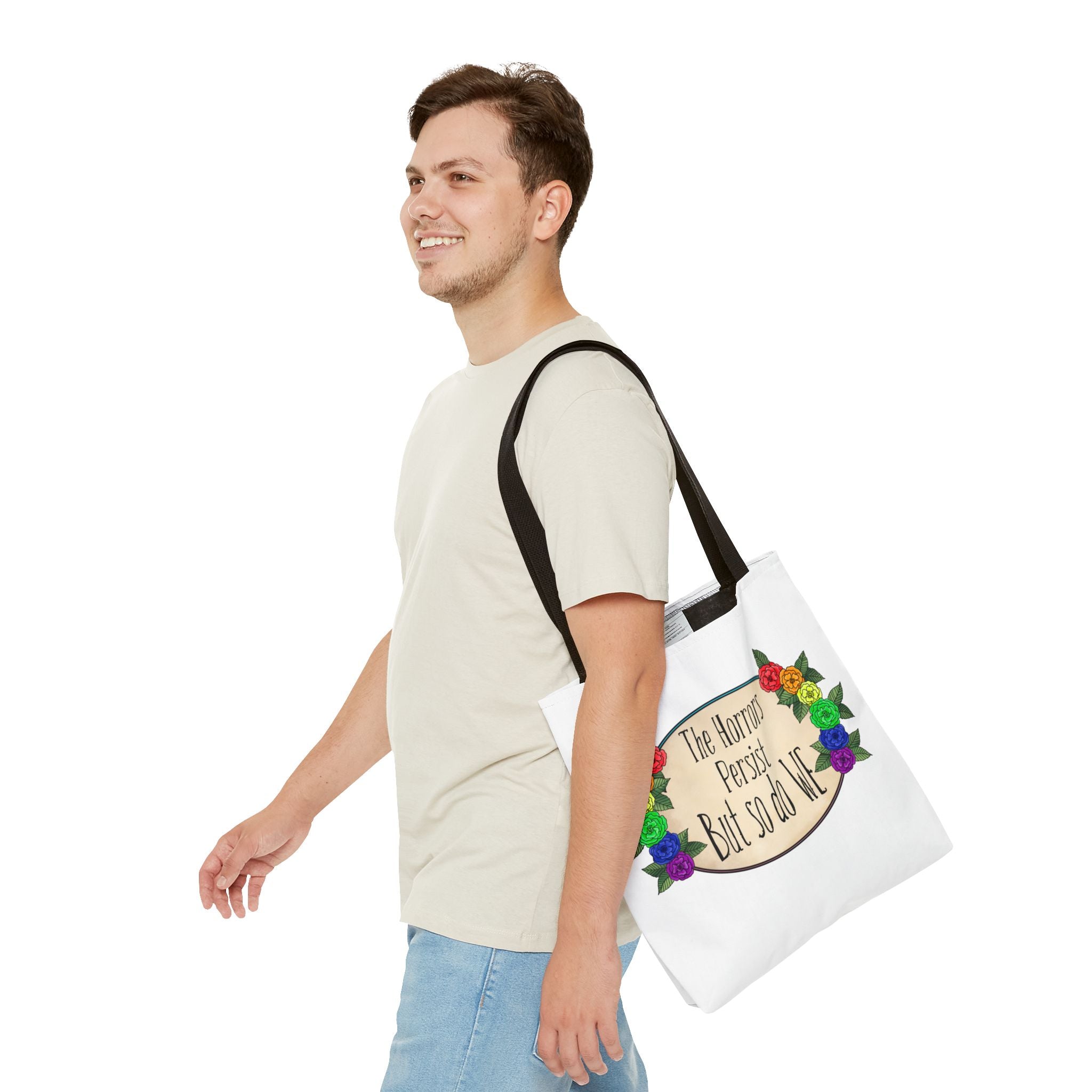 Introducing a beautifully crafted tote bag that seamlessly blends style and functionality. Made from durable polyester, this tote not only adds a pop of color to your outfit but also stands up to daily use. Its vibrant floral design carries a meaningful message, making it a perfect accessory for those who value resilience and positivity. Ideal for everyday errands, grocery shopping, or as a chic carry-all for work or school, this tote bag is relevant to anyone looking to express their individuality. Perfect for holidays, celebrations, or as a thoughtful gift for loved ones, it brings a touch of inspiration to any occasion. So whether you're headed to the beach, a picnic, or just out and about, this tote bag will keep your essentials stylishly organized.